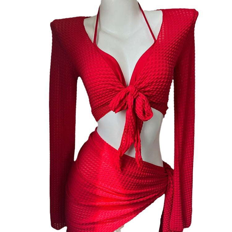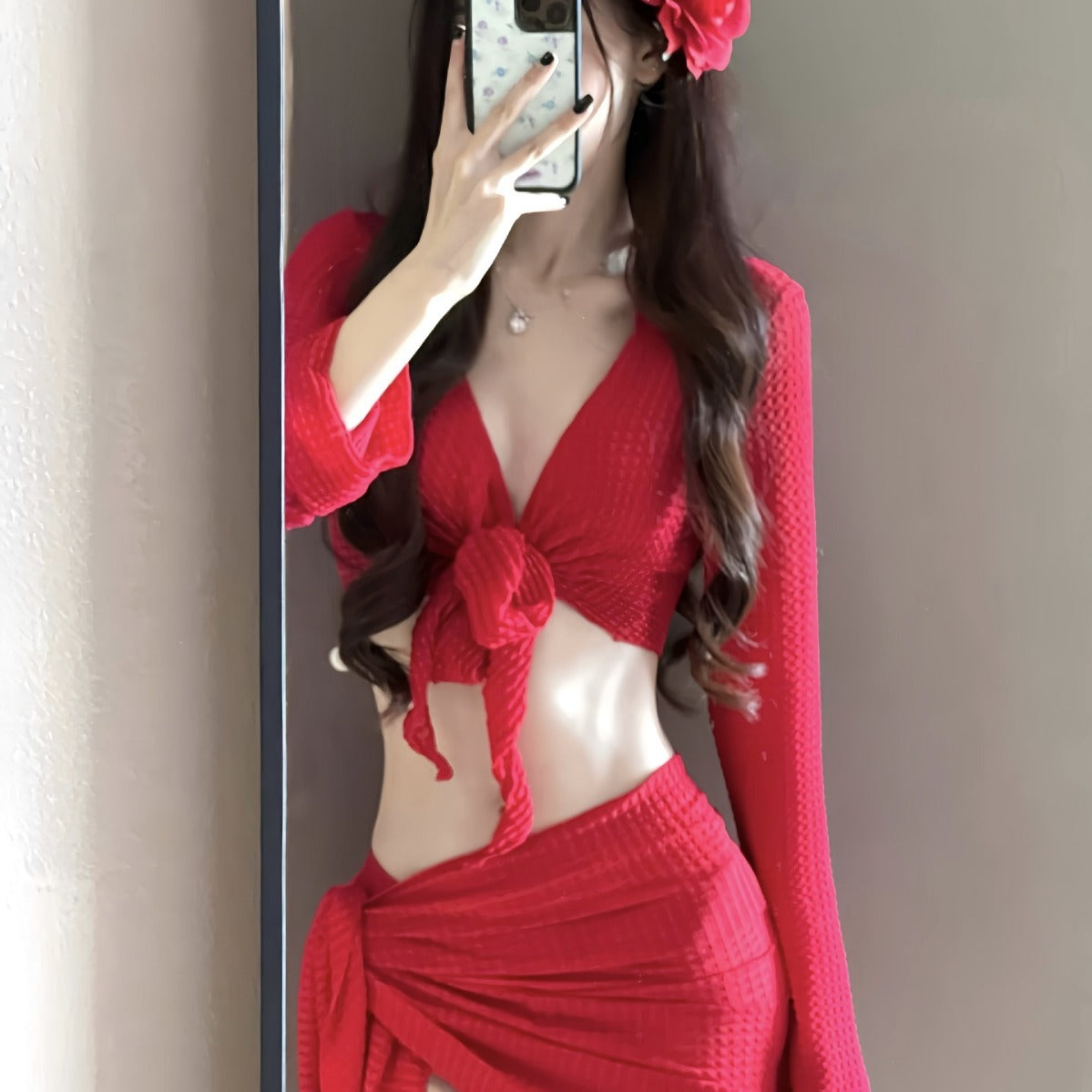 このクロスリボン付きシースルーセットは、女性らしい上品さとリゾート感を兼ね備えたデザインが特徴です。セパレートのトップスとスカート風のボトムが涼しげで軽やかな印象を与えます。透け感のある生地が程よい肌見せを実現し、ナイトプールやビーチリゾートなど特別なシーンにぴったりです。肌を適度に露出しつつも華やかさをプラスするデザインで幅広い女性に人気のアイテムです。