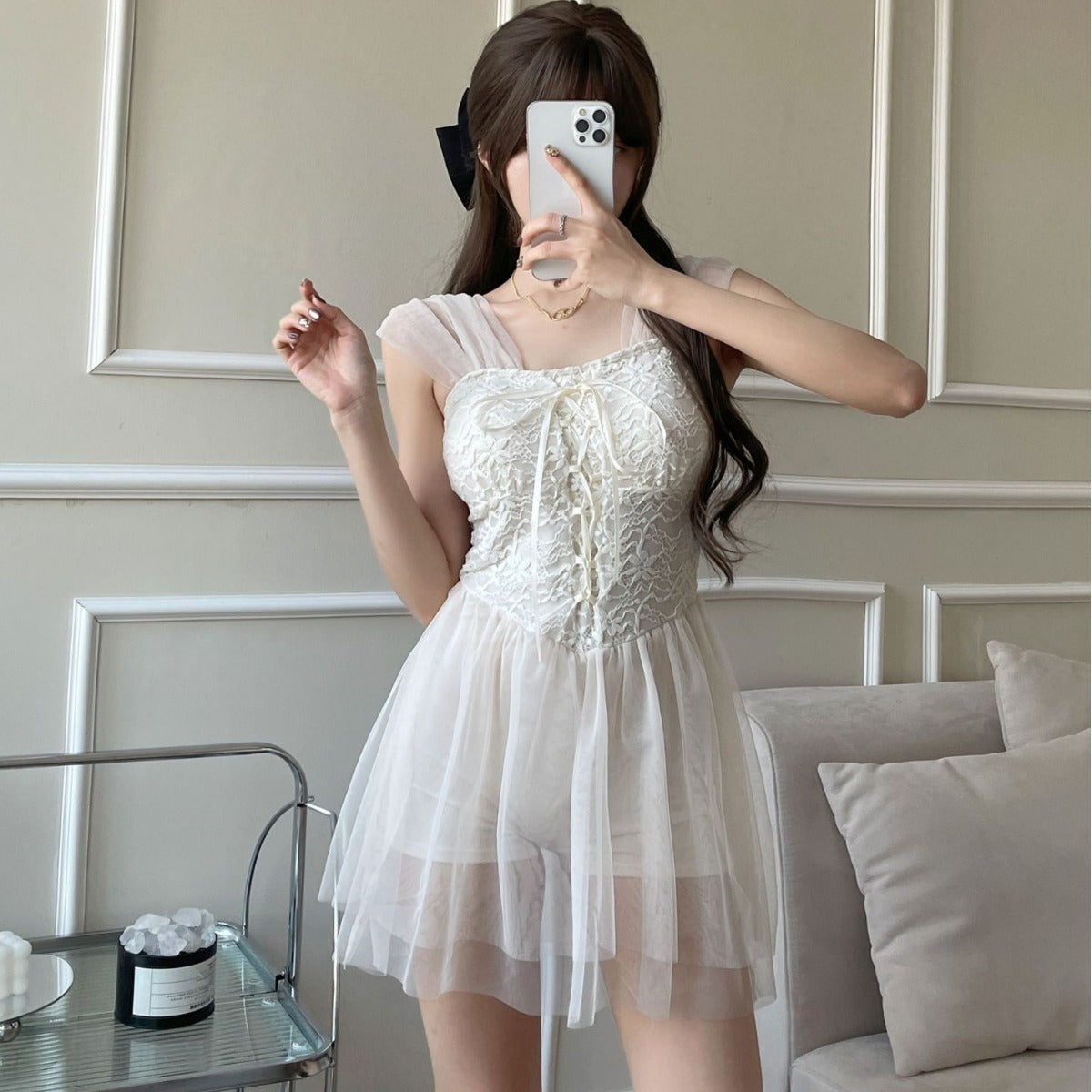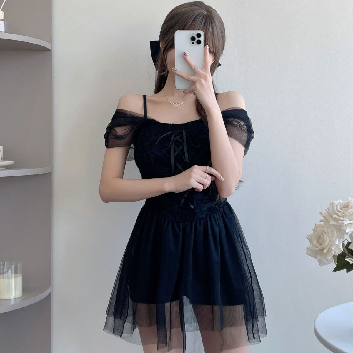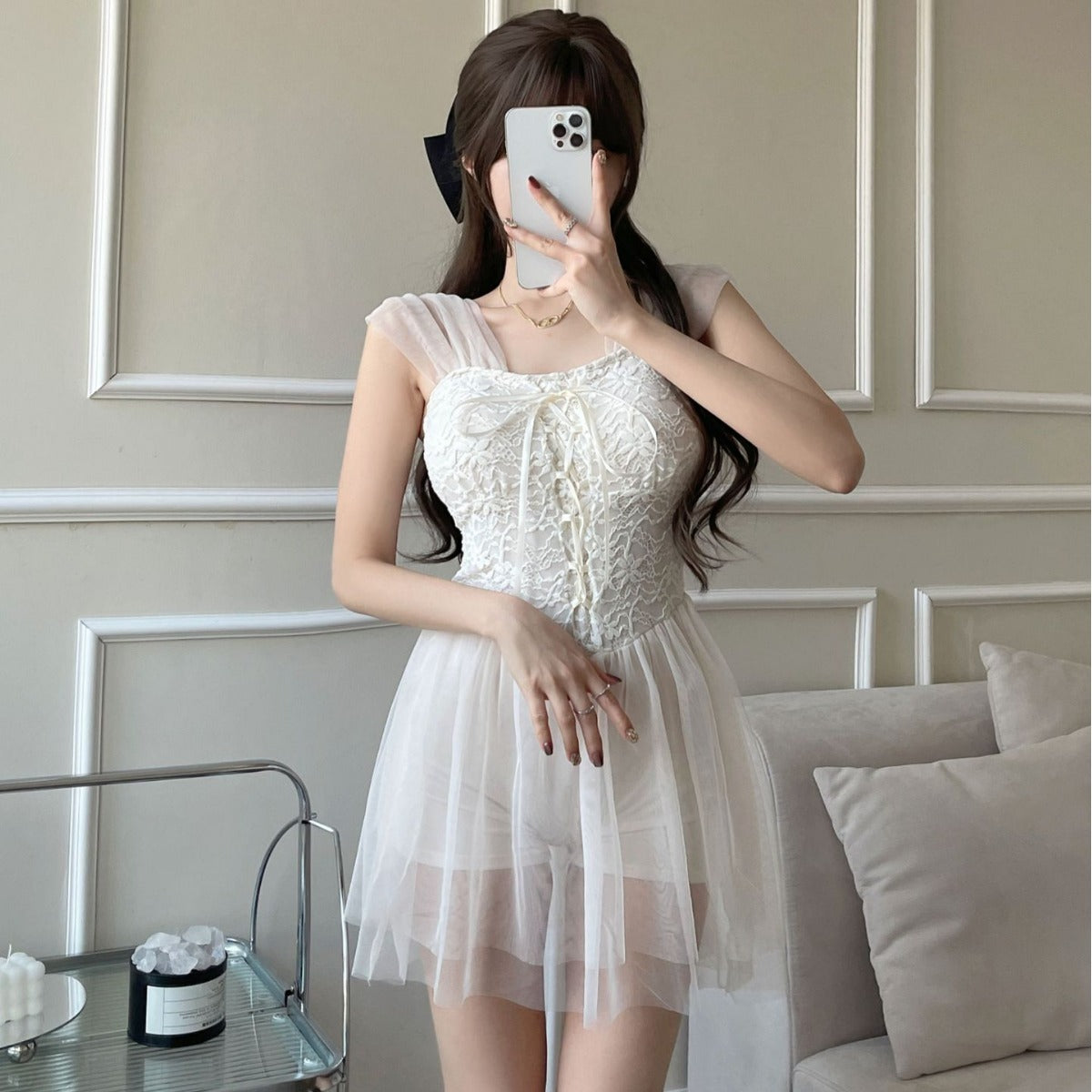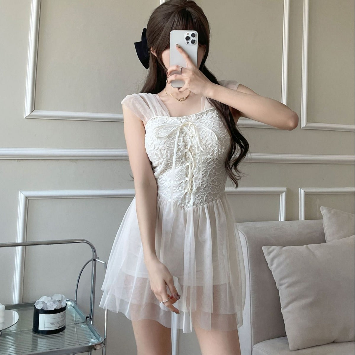 上品なレースと透け感が女性らしさを引き立て、着るだけで特別な気分になれる人気の水着です。オフショルダーとしても使えレースアップのデザインが華やかさをプラスし、気になる体のラインを自然にカバーします。スカート部分はふわりと広がり、エレガントでスタイルアップ効果も抜群です。ナイトプールやビーチリゾートなど、華やかなシーンで一目置かれるデザインなので、大人女子にもおすすめです。