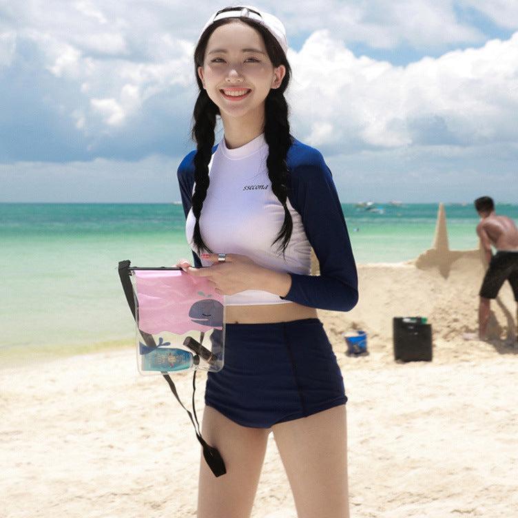 この水着は、ハイウエストのデザインがウエストを引き締め、スタイルアップ効果が抜群!さらに、長袖のラッシュガードが腕をしっかりカバーし、日焼け対策にも最適です。
