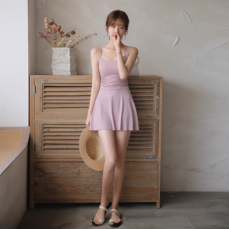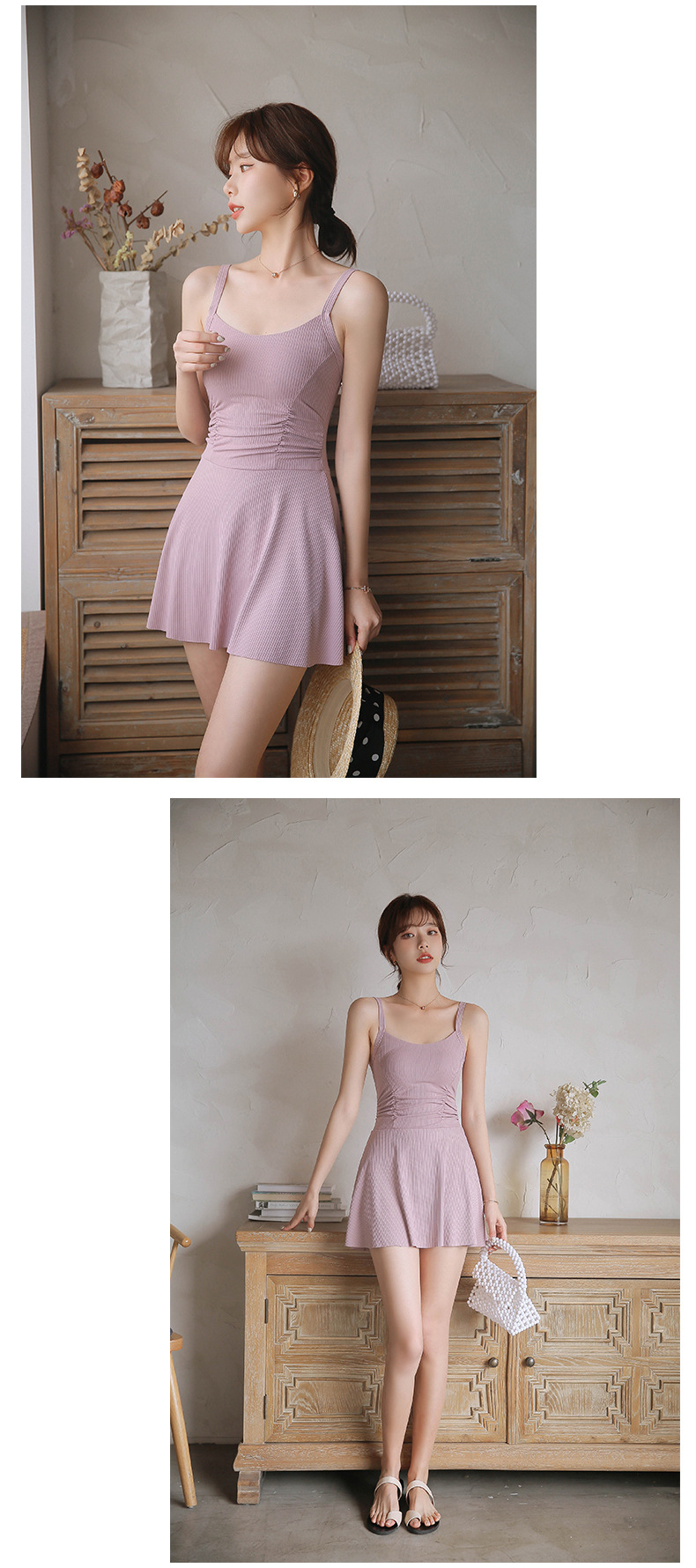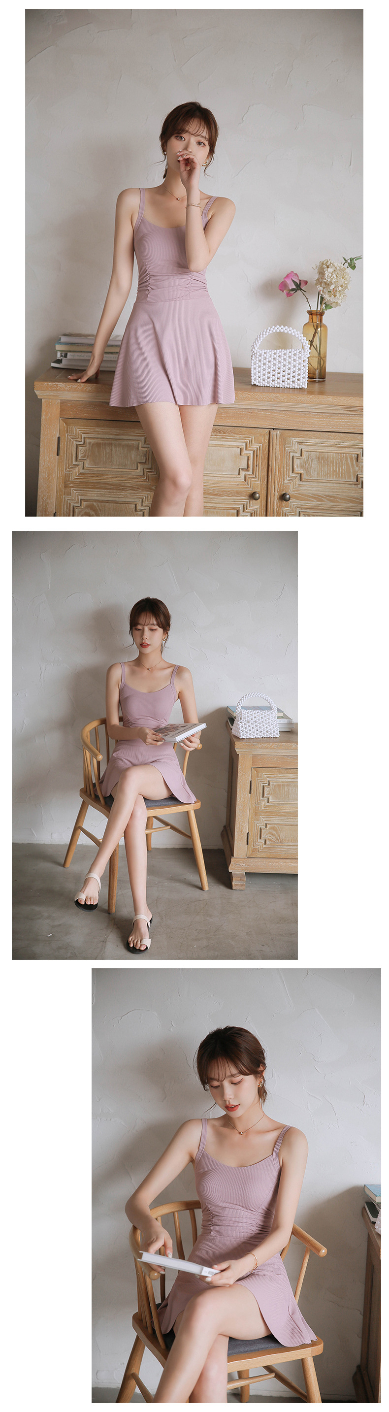 両肩のストラップが安定感を与え、背中にはおしゃれなレースアップが施されています。裾がスカートのように広がり、下半身をさりげなくカバーしつつ、お腹まわりも隠せるデザインです。さらに、ウエスト部分のギャザーが体のラインをカバーし、全体的に美しいシルエットを演出します。ビーチやリゾート、ナイトプール、プールなどのシーンで、上品に際立つ一着です。