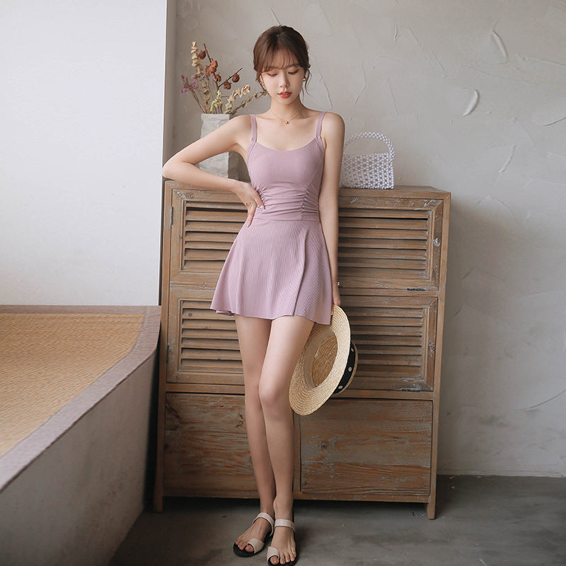 両肩のストラップが安定感を与え、背中にはおしゃれなレースアップが施されています。裾がスカートのように広がり、下半身をさりげなくカバーしつつ、お腹まわりも隠せるデザインです。さらに、ウエスト部分のギャザーが体のラインをカバーし、全体的に美しいシルエットを演出します。ビーチやリゾート、ナイトプール、プールなどのシーンで、上品に際立つ一着です。