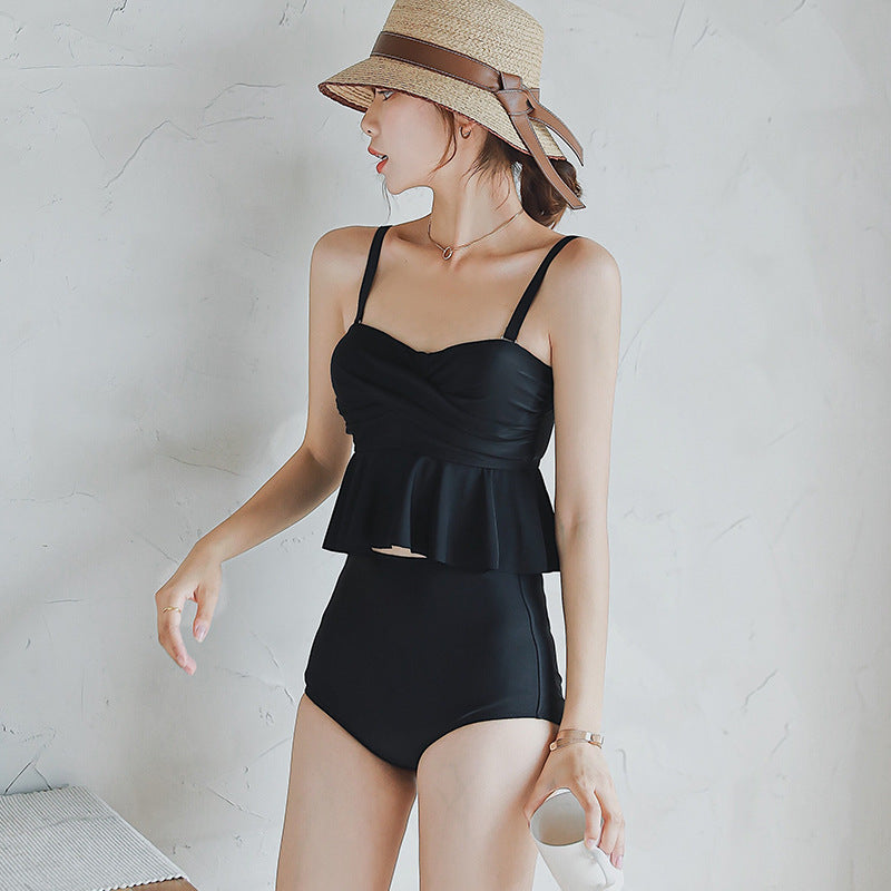 胸元をキープするデザインでバストラインをきれいに見せつつ、フリルが気になるお腹をカバーしてくれます!ハイウエストのボトムで脚長効果も抜群です!