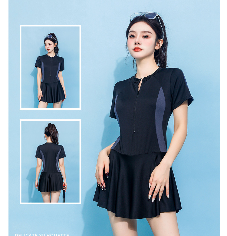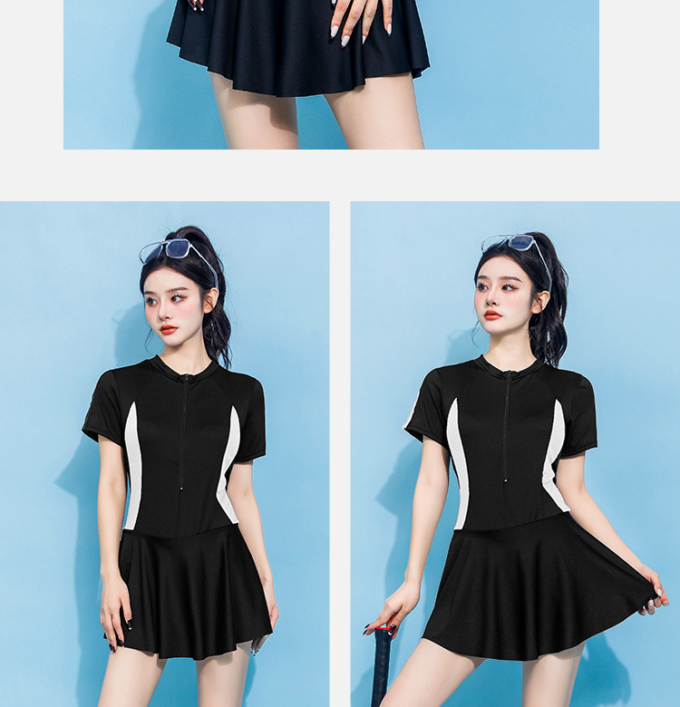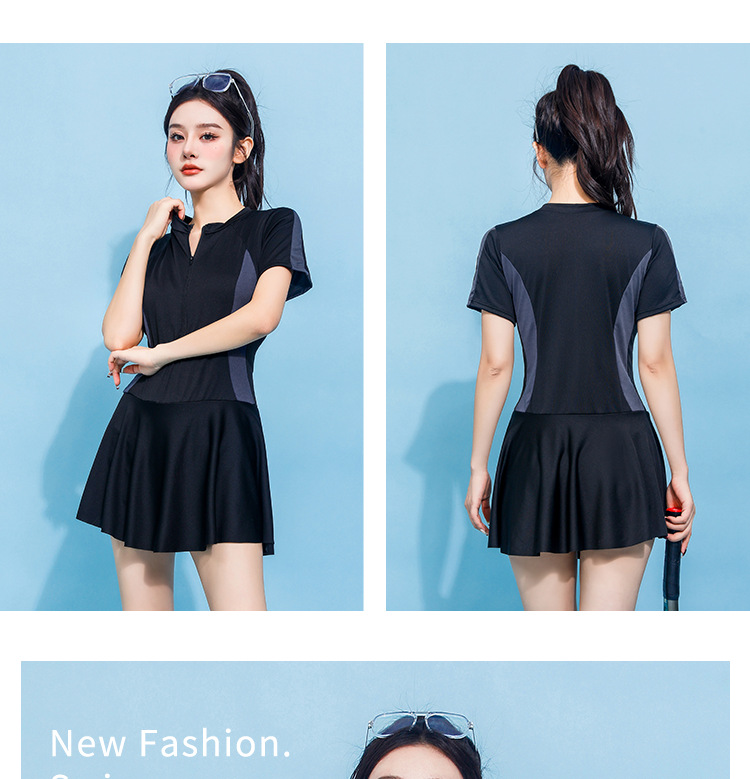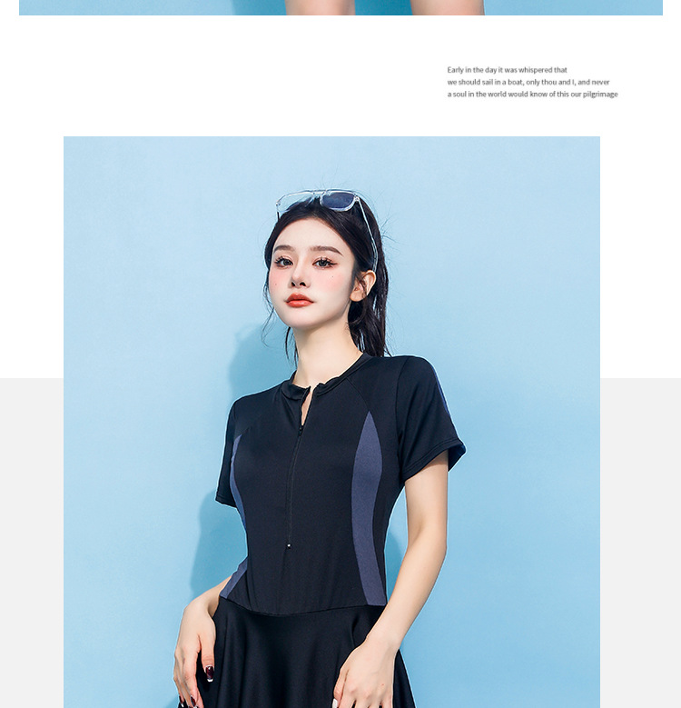 スポーティーなデザインが魅力のフレアスカート付き水着です。トップス部分はジッパー付きのハーフハイネック仕様で動きやすく、程よい露出度で安心して着用できます。ウエストラインを引き締めるカラーコントラストが、スタイルアップ効果を演出。フレアスカートがヒップや太ももを自然にカバーしつつ、軽やかな動きやすさを実現しています。ビーチやプールはもちろん、スポーツやアクティブなシーンにもぴったりの一着です。体形を気にせず、快適におしゃれを楽しめるアイテムです。