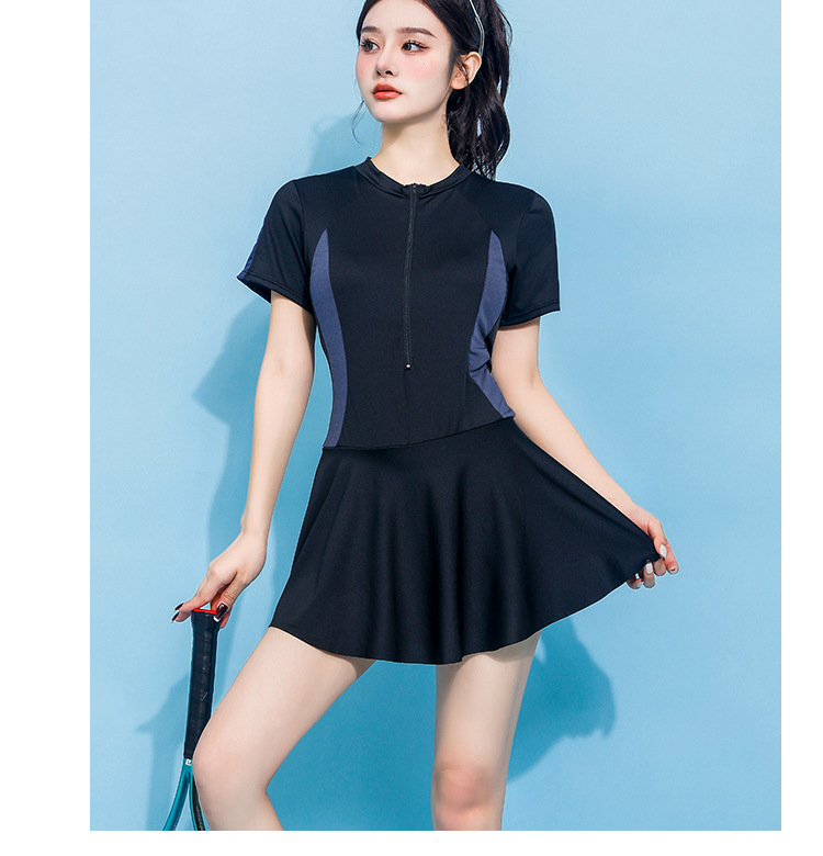ジッパー付きトップスで着脱が簡単!フレアスカートが気になるヒップや太ももをしっかりカバーしてくれます。スポーツにも最適です!