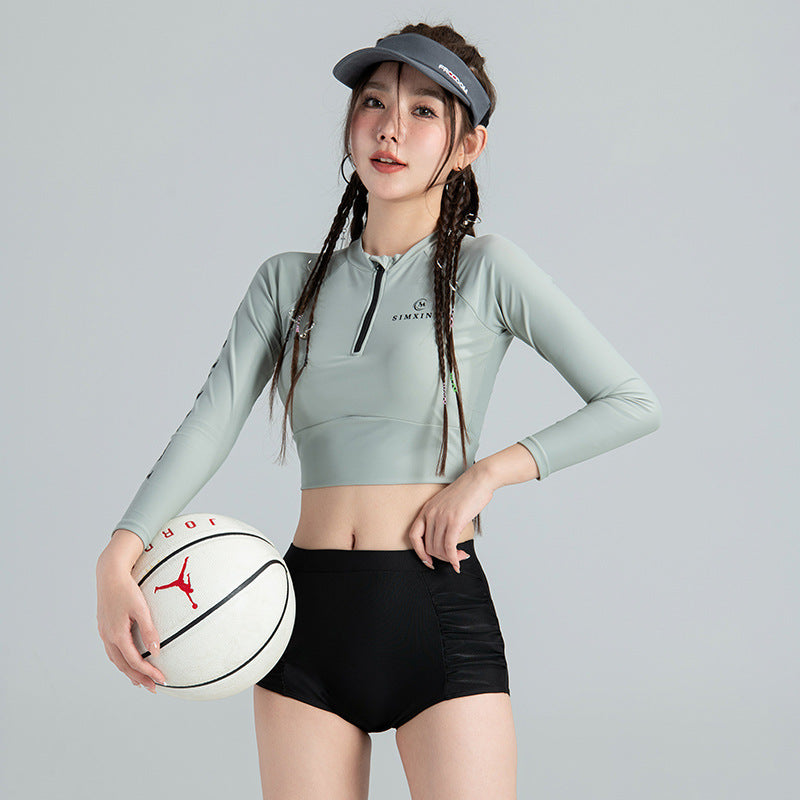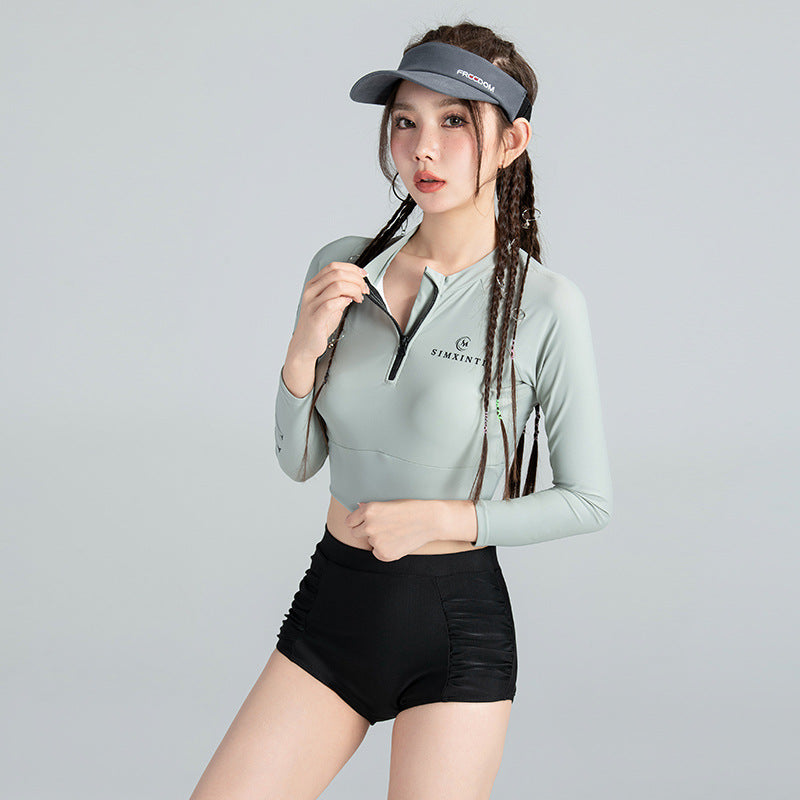 機能性とスタイルを兼ね備えたラッシュガードセットです。長袖トップスは紫外線対策に優れた設計で、露出を抑えながらスタイリッシュに仕上げています。フロントジッパーがアクセントとなり、着脱もスムーズ。ショートパンツは動きやすさ抜群で、フィット感も◎。ビーチやプールだけでなく、スポーツやサーフィンなどアクティブなシーンにもぴったりです。落ち着いたカラーリングとシンプルなデザインは、大人の女性におすすめです。