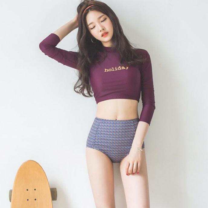 長袖トップスが肩や腕をしっかり覆い、日焼けを防ぐのはもちろん、肩幅をカバーするデザインが嬉しい!また、ハイウエストボトムスはお腹まわりをスッキリ見せてくれます。