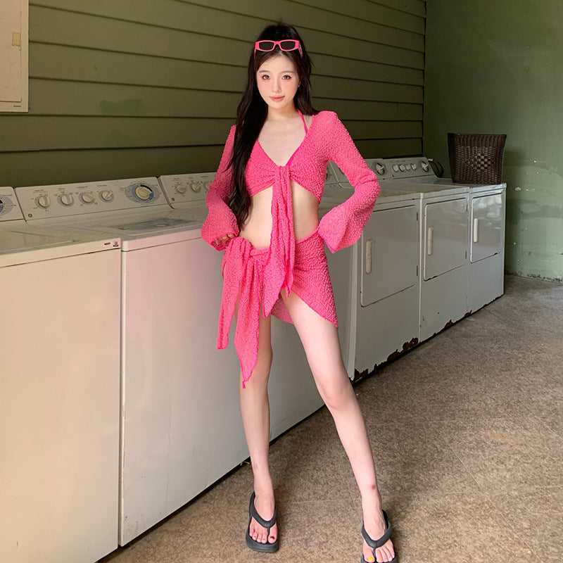 華やかなピンクカラーが目を引く三角ビキニと、シアーな質感のカバーアップがセットになった一品です。Vネックのビキニトップはリボンで可愛さをプラスし、肩紐の調節でフィット感も抜群。カバーアップは透け感のある素材で、リラックス感を演出しつつ日焼け対策もばっちり。プールサイドやビーチリゾートでの移動も気軽に楽しめます。女性らしさと快適さを両立した、夏の必需品です。