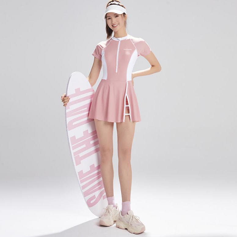 アクティブな女性にぴったりのラッシュガードタイプのワンピース水着です。爽やかなピンクカラーとスポーティなデザインが特徴で、可愛さと機能性を兼ね備えています。スカート部分のスリットが軽やかな印象を与えつつ動きやすさをプラス。ラッシュガードタイプなので、紫外線対策や肌の露出を抑えたい方にもおすすめです。ビーチやプール、サーフィンやスポーツシーンでの使用に最適。女性らしいシルエットと安心感を提供する一着です。