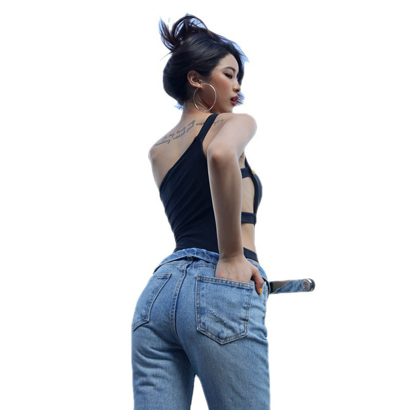スタイリッシュなワンショルダーデザインが特徴的なカットアウト水着です。ゴールドボタンがアクセントになり、ラグジュアリーで洗練された印象を演出します。ウエスト部分の大胆なカットが女性らしいラインを際立たせ、ビーチやリゾートシーンで視線を集めること間違いなしです。セクシーさと上品さを兼ね備えたデザインで、特別な日の水着としておすすめです。