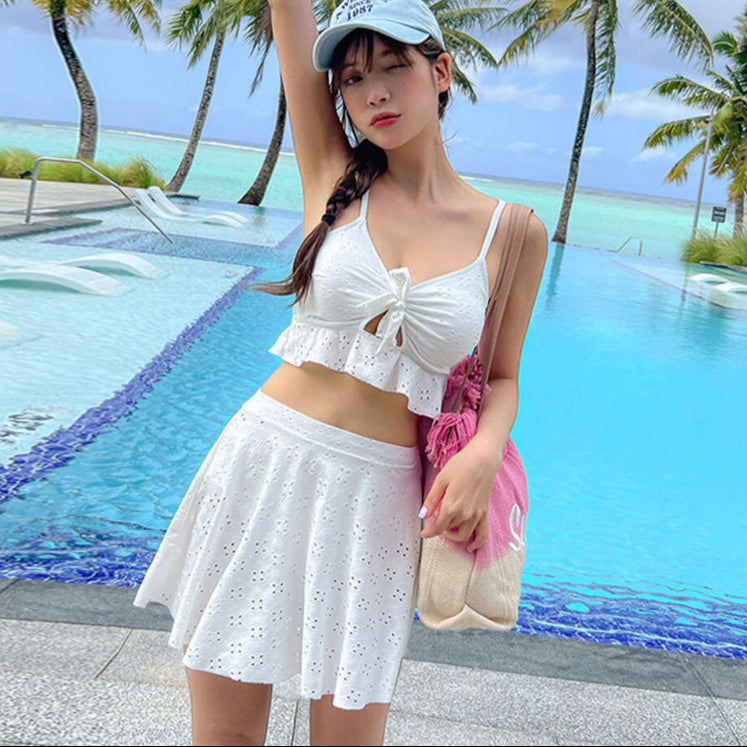 ビキニ 水着 フリルデザイン リボン 刺繍風のテキスチャー スカートセット 体形カバー
