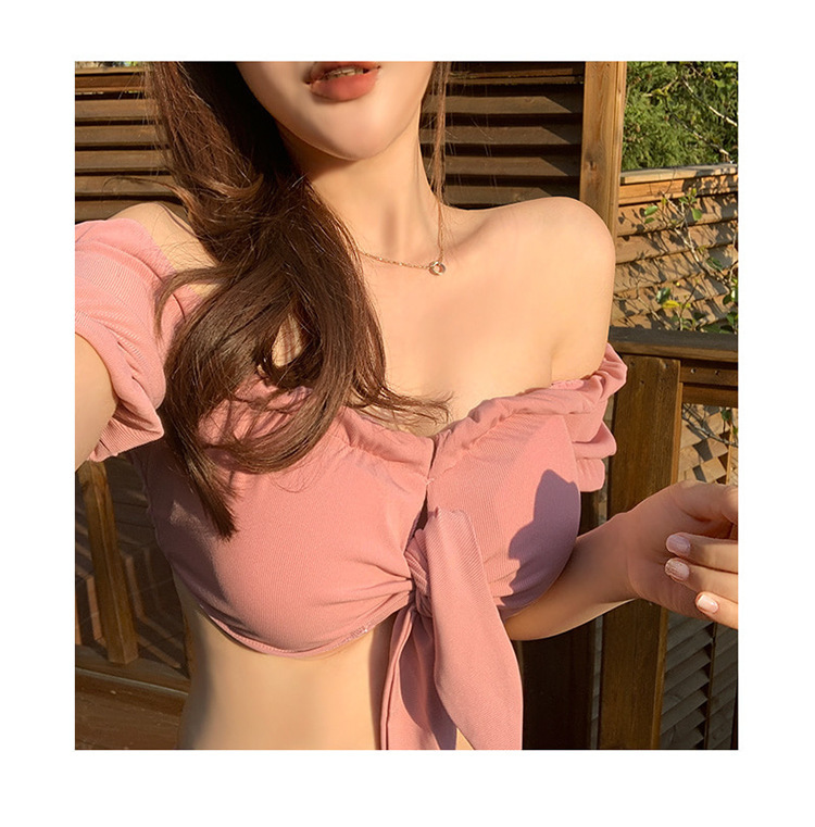 ハイウエストボトムでお腹周りをしっかりカバーしつつ、オフショルダーのデザインが肩や腕を華奢に見せてくれます!リボンのアクセントで視線を上に引きつける効果も抜群です。