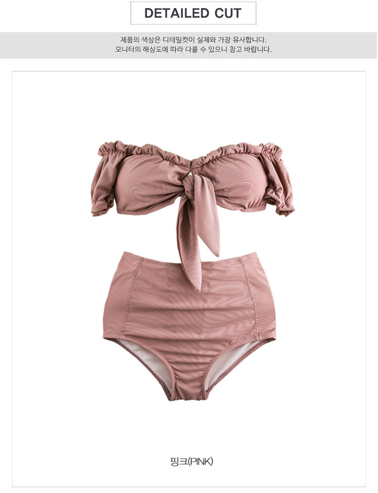 上品でかわいらしいオフショルダーデザインのハイウエスト水着です。トップスにはボリューム感のあるリボンがアクセントとなり、胸元を美しく見せてくれます。また、ハイウエストのボトムはお腹周りをカバーしつつ、脚長効果も期待できるデザインです。ショルダー部分はゴム仕様でしっかりフィットし、動きやすさも抜群。リラックスしたビーチリゾートやプールでの使用にぴったりです。着るだけで女性らしさが引き立つ一着となっています。