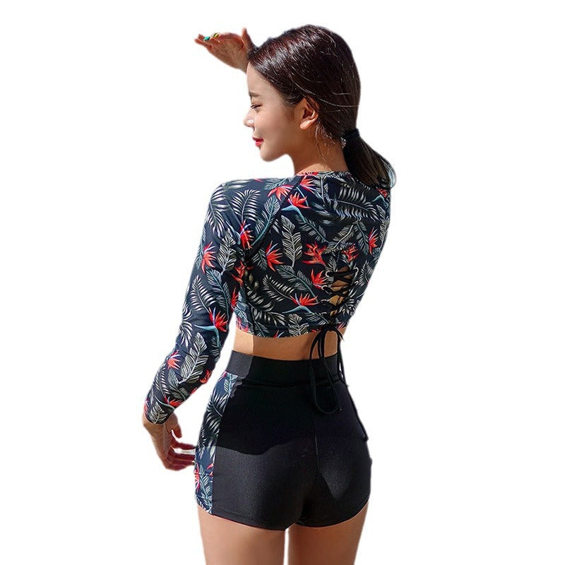 リーフ柄が目を惹くデザインのロングスリーブラッシュガードセットです。上下セパレートタイプで、トップスはクロップド丈のスタイリッシュなデザイン、バックは編み上げリボン仕様で可愛らしさをプラスしました。ショートパンツはハイウエスト仕様で、体型カバーとスタイルアップを両立。スポーツ・サーフィンやビーチリゾート、プールでの着用にぴったりです。長袖なので日焼け対策にも最適で、アクティブなシーンでも安心してご使用いただけます。