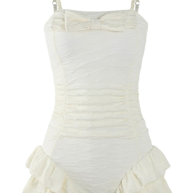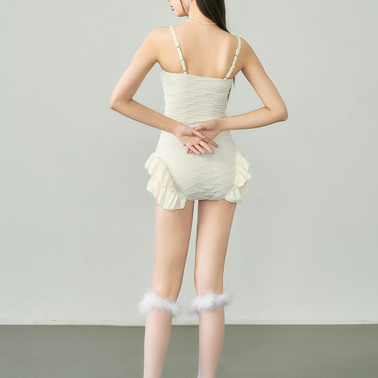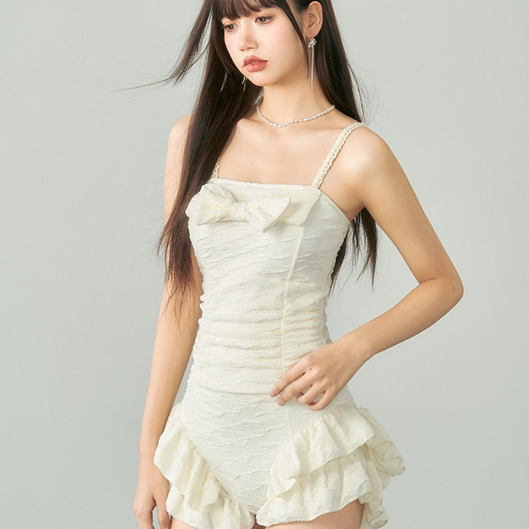 クラシカルなデザインが目を引くワンピース型の水着です。胸元の大きなリボンとフリルディテールが上品でかわいらしい印象を演出します。ウエストのシャーリング加工でボディラインを美しく見せつつ、フリルスカートが下半身をさりげなくカバーしてくれます。バックスタイルもシンプルながら細部にこだわり、女性らしさを引き立てます。ビーチやリゾート地での優雅なひとときを過ごすのにぴったりな一着です。
