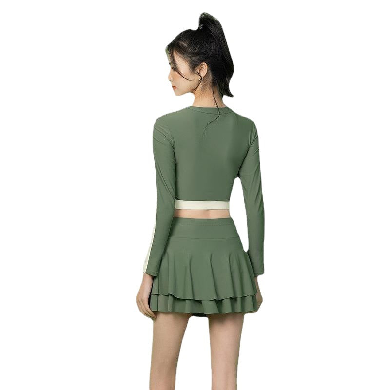 スカートタイプのボトムスが下半身をカバーしつつ、フレアの動きで華やかさを演出!さらに長袖トップスで肩や腕をしっかり隠せるので、日焼けが気になる方にもおすすめです。