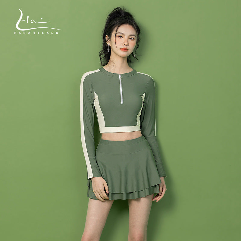 アクティブに動きたい大人女性におすすめのラッシュガードセットです。長袖のトップスは、肩や腕の日焼け対策をしっかりサポート。胸元のジッパーデザインがスポーティーな印象を与えつつ、スタイリッシュなアクセントになっています。フレアスカート付きボトムスは、動きやすさと女性らしいシルエットを両立。ビーチやプールだけでなく、サーフィンやヨガなど多彩なアクティビティに活躍します。体形をさりげなく整え、快適な着心地を実現したデザインです。大人っぽく上品なカラーリングも魅力的です。