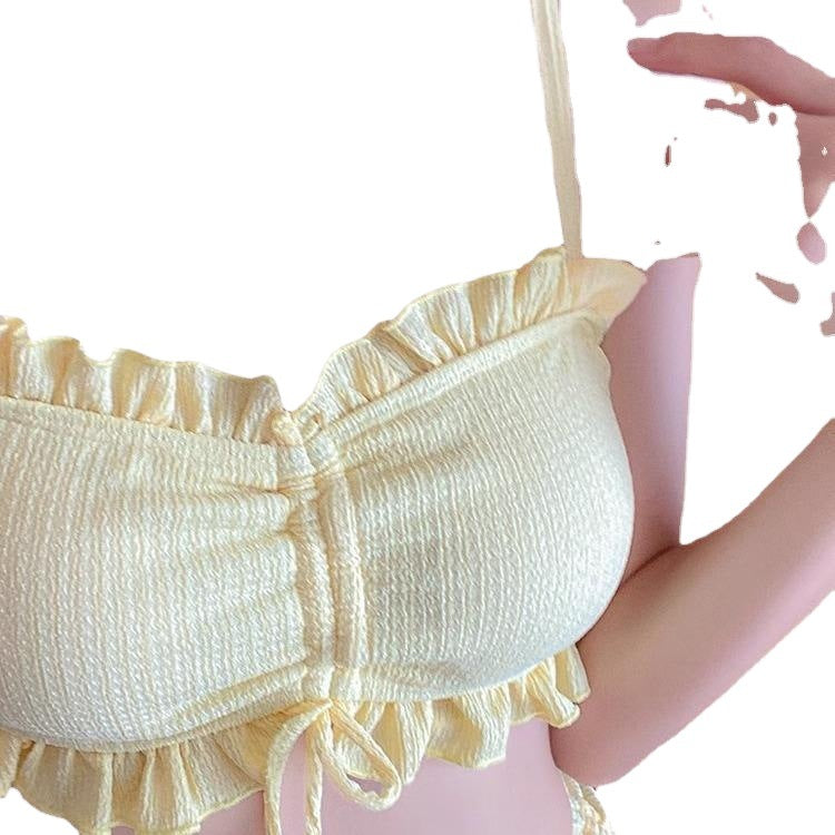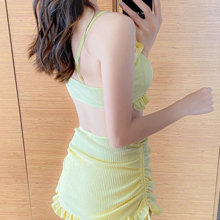 フリルがたっぷり施されたトップスと、調整可能なドローストリングデザインのスカートがセットになったビキニです。スカートは取り外し可能で、ビキニスタイルとカバーアップスタイルの2通りを楽しめます。女性らしさを引き立てるディテールが詰まっており、ビーチやリゾート、プールサイドでも注目を集めるアイテムです。軽やかな素材と鮮やかなカラーで、夏のイベントにぴったりのデザインとなっています。