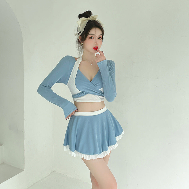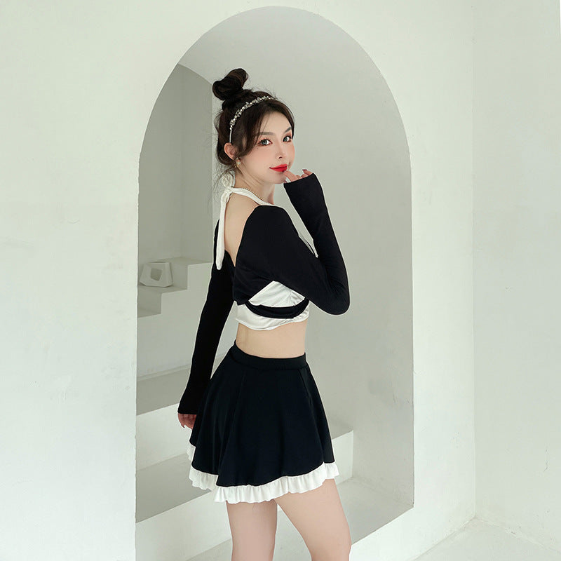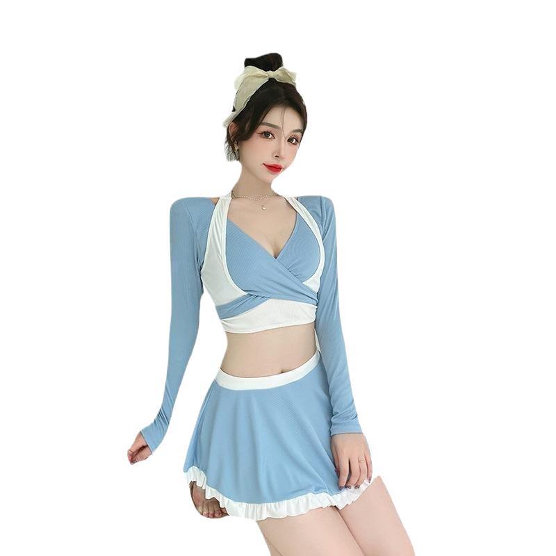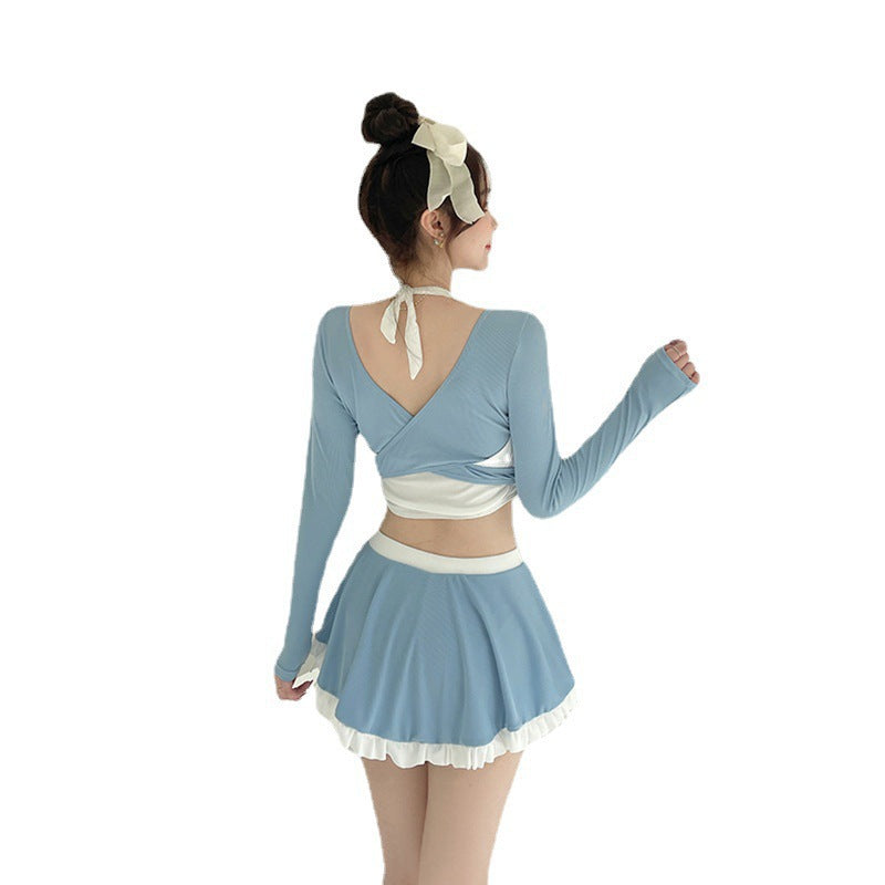 [商品名]:タンキニ 水着 クロスデザイン 長袖 スカート スタイルアップ フレア 体形カバー