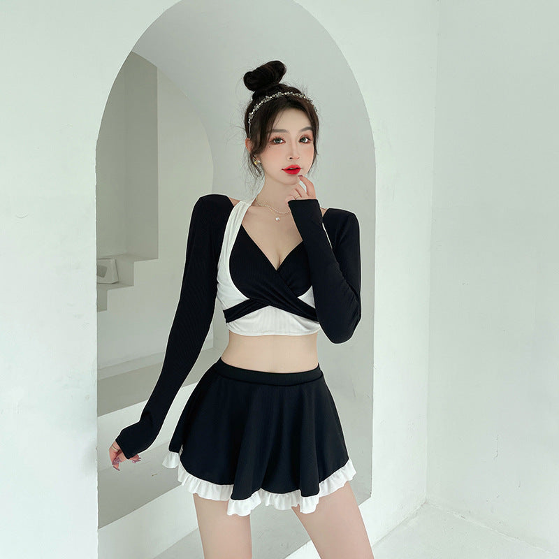 優雅さと快適さを兼ね備えたフレアスカート付きのタンキニセットです。トップスはクロスデザインでウエストラインを引き立て、スカートは裾のフリルが女性らしさを演出します。長袖トップス付きで日焼け対策にもおすすめ。取り外し可能なパッドがついているので、しっかりとしたサポート力があります。ビーチリゾートやプールサイドだけでなく、スポーツやアクティビティにもぴったりのデザインです。快適さとスタイルアップを両立した大人女子のための一着です。