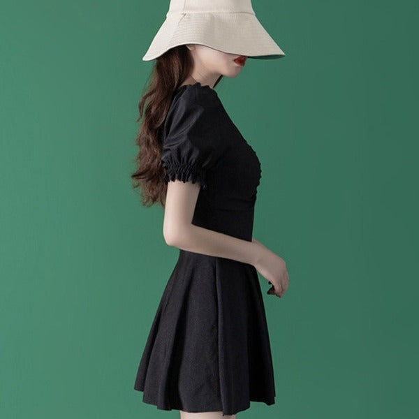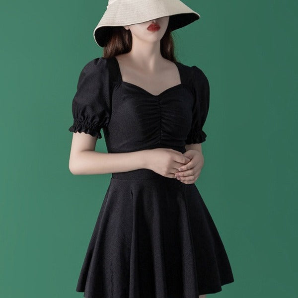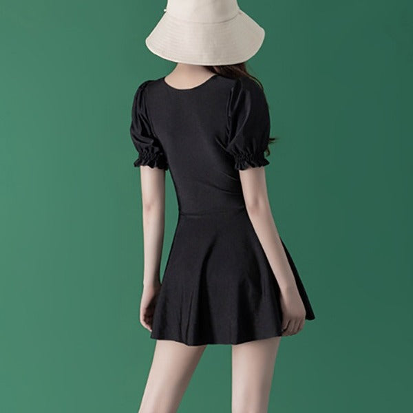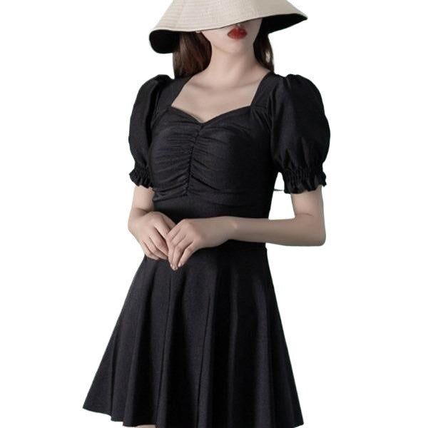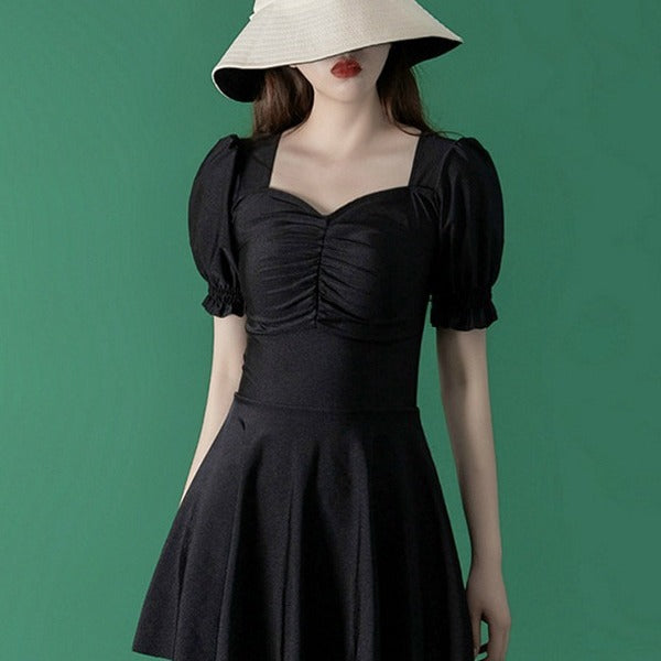 [商品名]:ワンピース 水着 パフスリーブ ギャザーデザイン フレア 体形カバー