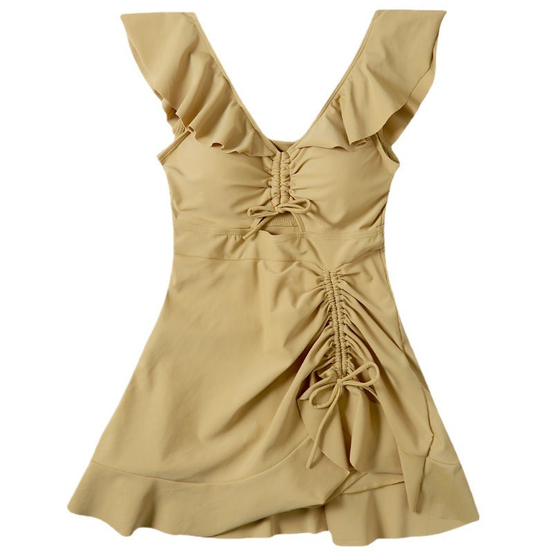 リゾート気分を満喫できる、エレガントなデザインのフリル付き水着ドレスです。Vネックとカットアウトディテールがデコルテを美しく魅せ、ウエスト部分のシャーリングとリボンで女性らしいラインを強調します。アシンメトリーな裾が動きに合わせて優雅に揺れ、ビーチリゾートやナイトプールなど特別なシーンにぴったりです。しっかりとした生地感で、気になる箇所もさりげなくカバーしてくれるのが嬉しいポイントです。