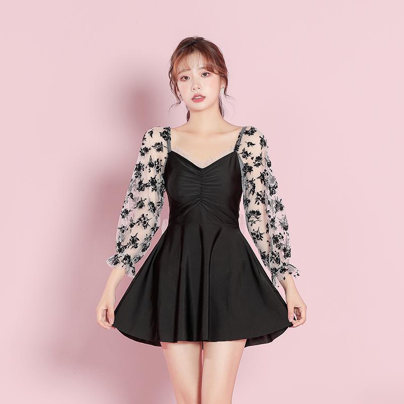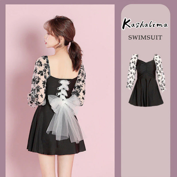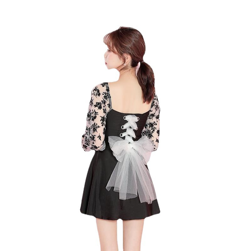 繊細なレーススリーブがポイントのワンピースタイプの水着です。袖の透け感とフレアスカートが女性らしさを演出し、デザイン性と機能性を兼ね備えています。胸元のギャザーがスタイルを美しく見せ、バックリボンが後ろ姿もおしゃれに仕上げます。露出を抑えつつも、優雅でかわいい印象を与えるデザインは、プールやビーチリゾート、ナイトプールでも活躍します。日焼け対策をしたい方や上品な水着をお探しの方におすすめです。