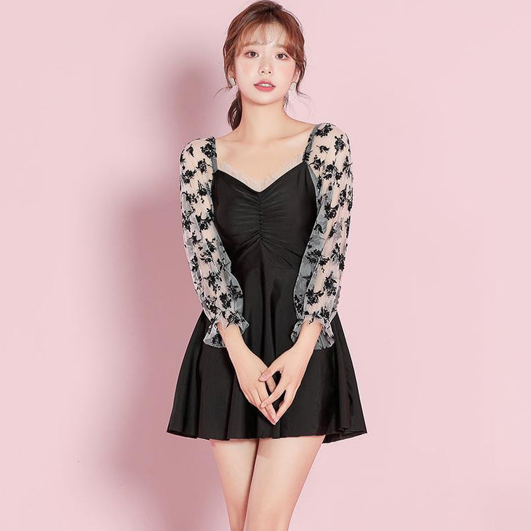 ワンピース 水着 エレガントレーススリーブ ギャザーがスタイル フレア 体形カバー