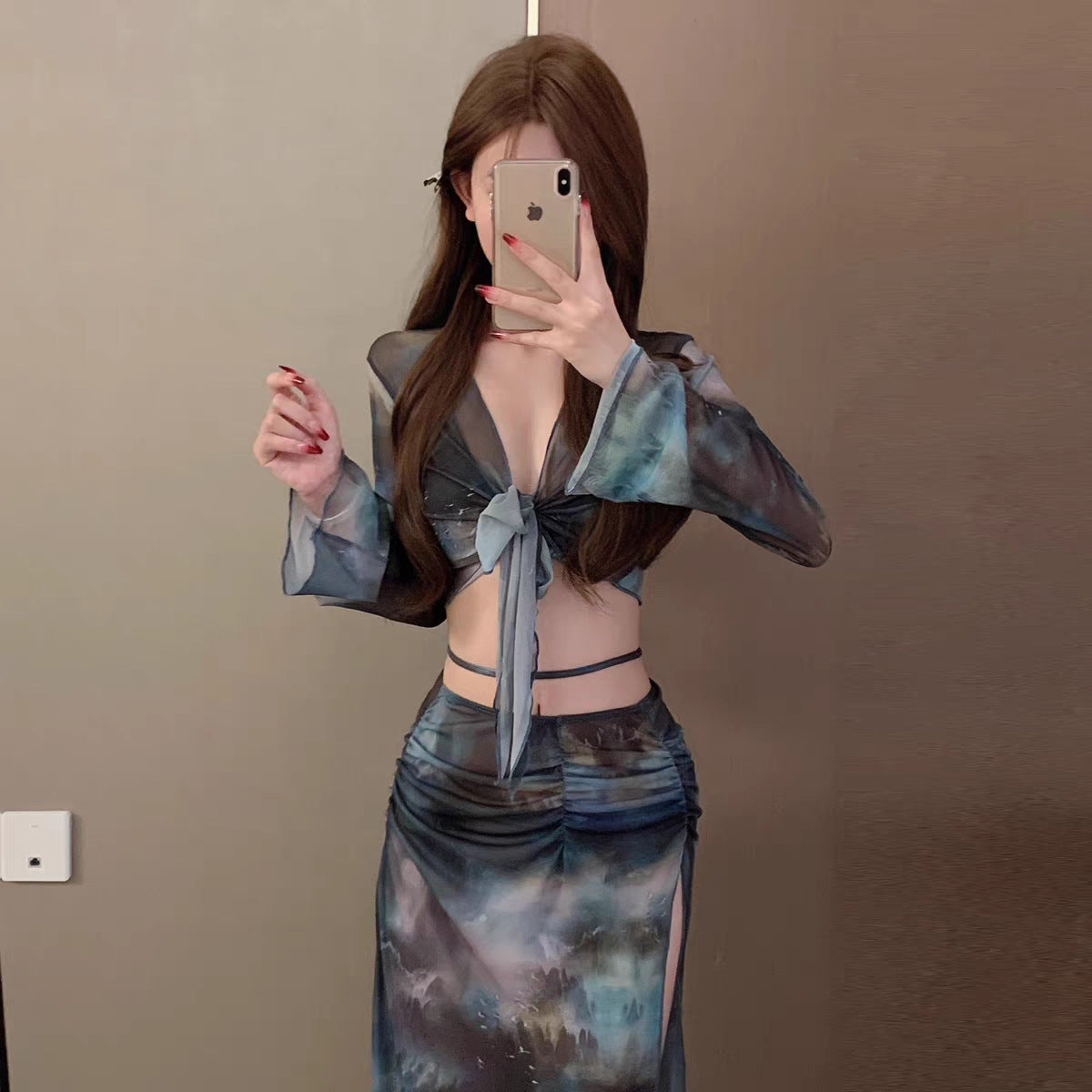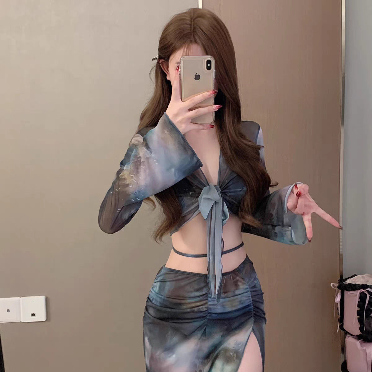 洗練されたシックなデザインが魅力のシースルーセットアップ水着。クロップド丈のトップスはフロントリボン仕様で、程よい透け感のあるロングスリーブが大人の魅力を引き立てます。ボトムスはスリット入りのスカート付きで、動くたびに女性らしいシルエットを演出。ビーチリゾートやナイトプールなど特別なシーンにもぴったりな一着です。大胆な肌見せとエレガントなデザインを両立した水着で、ワンランク上のスタイルを楽しめます。
