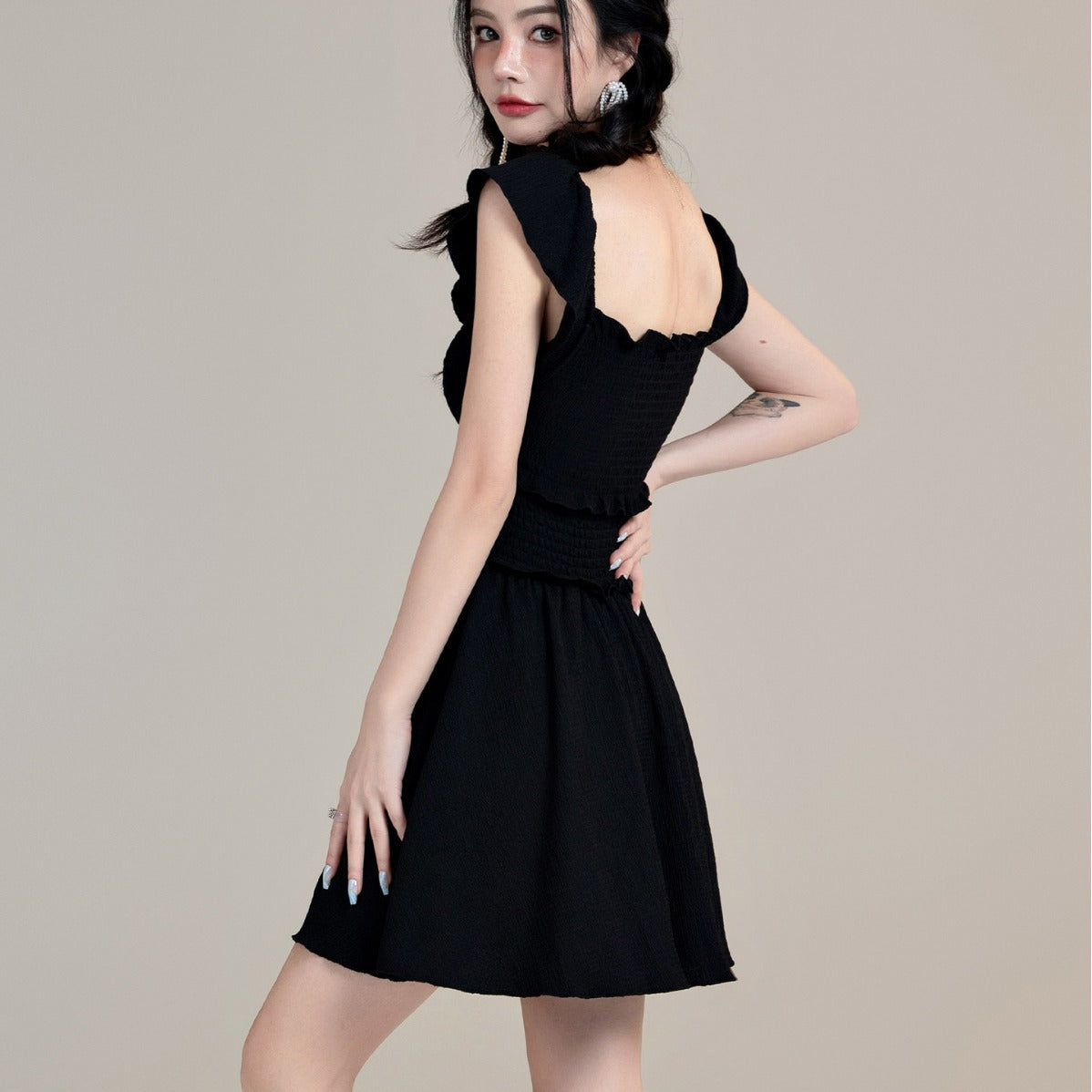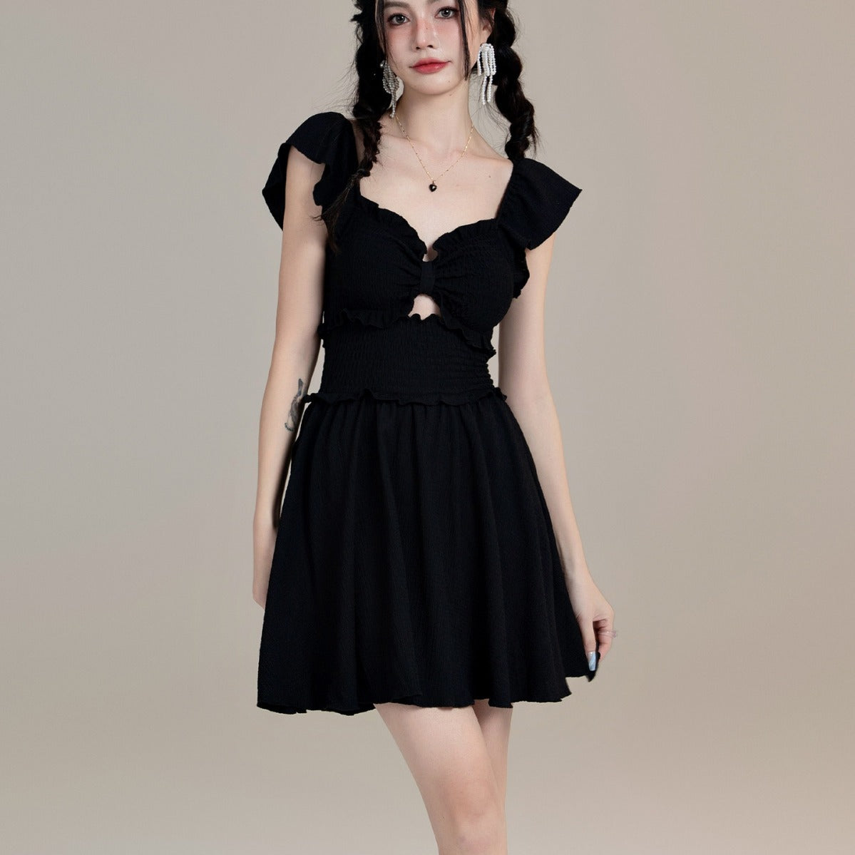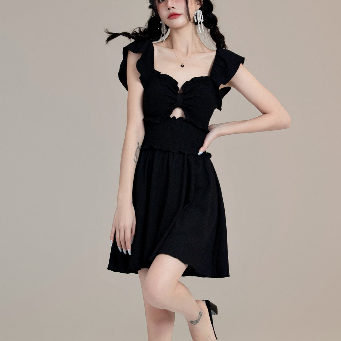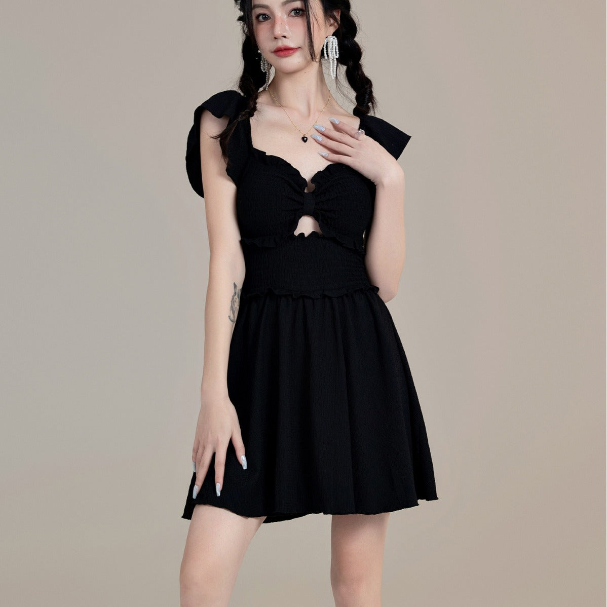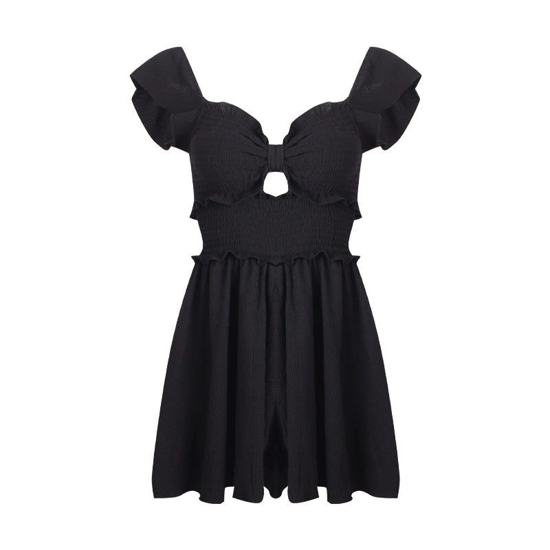 洗練されたシルエットが魅力のワンピース。胸元のカットアウトデザインがほどよく肌見せし、フリル付きのディテールがフェミニンな印象を与えます。ウエスト部分のシャーリングがしっかりフィットし、スタイルアップ効果も期待できます。スカート部分はフレア仕様で動きやすく、エフォートレスな雰囲気を演出。デートやおしゃれなディナー、リゾート地での着用にもぴったりな一着です。