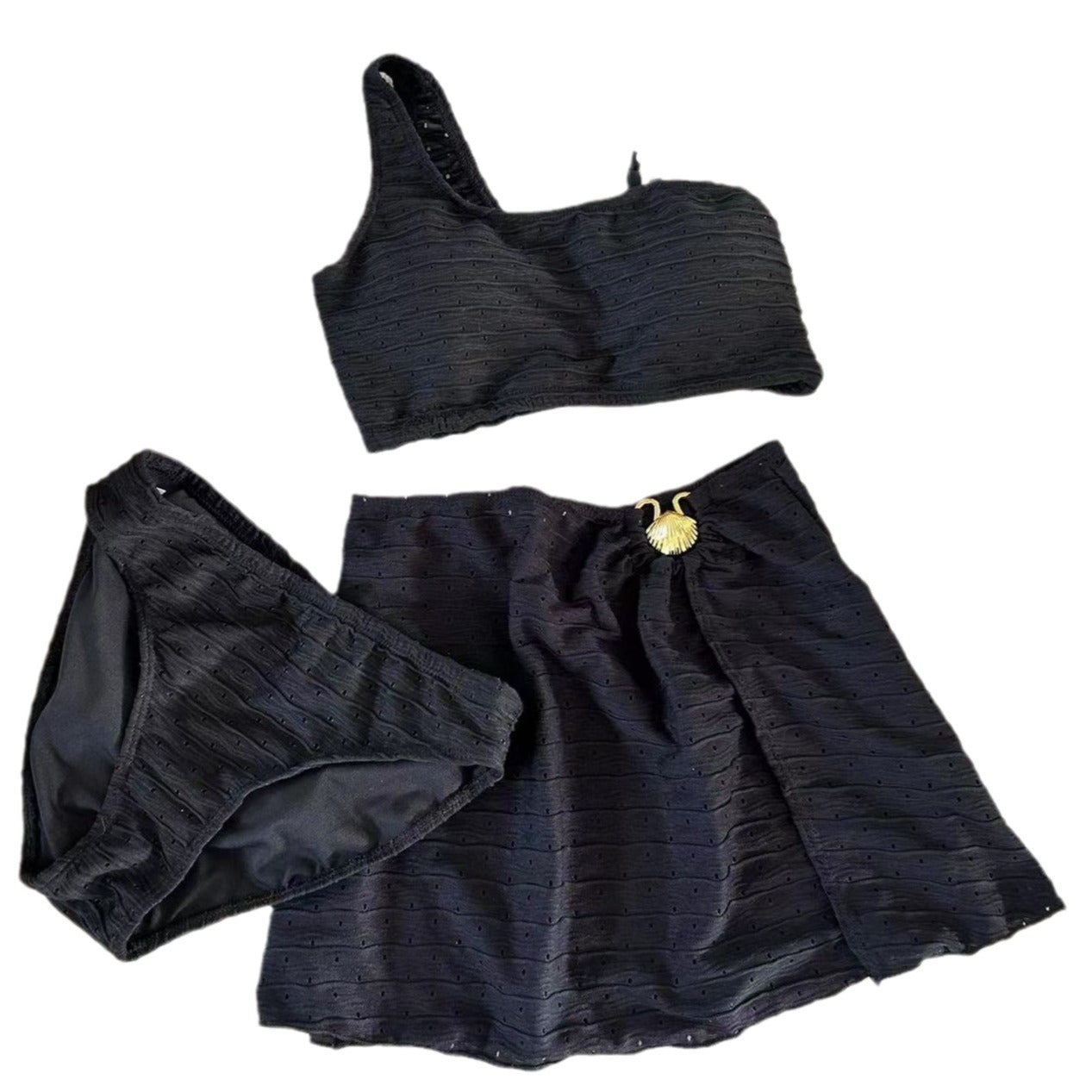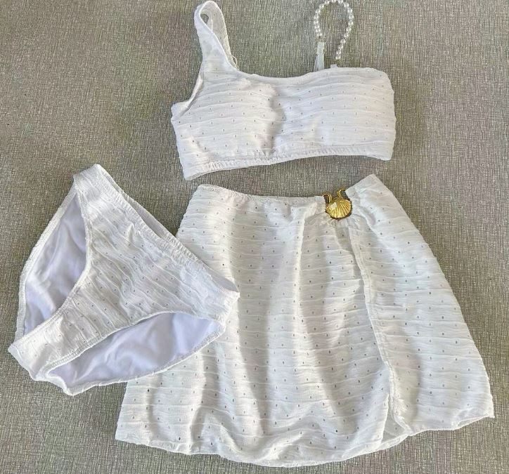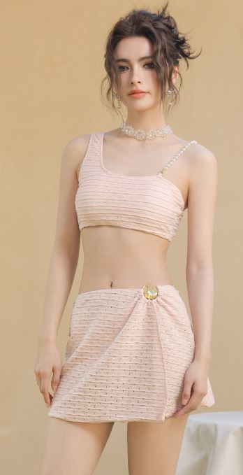 上品なパールストラップが目を惹くワンショルダータイプのビキニセット。程よいフィット感のあるトップスとシンプルなショーツに、巻きスカートをプラスすることで、エレガントな雰囲気を演出します。パールディテールがアクセントになり、大人女子のリゾートスタイルにぴったり。海やプールだけでなく、ナイトプールやラグジュアリーなリゾート地にもおすすめです。おしゃれと体型カバーの両方を叶えるアイテムです。