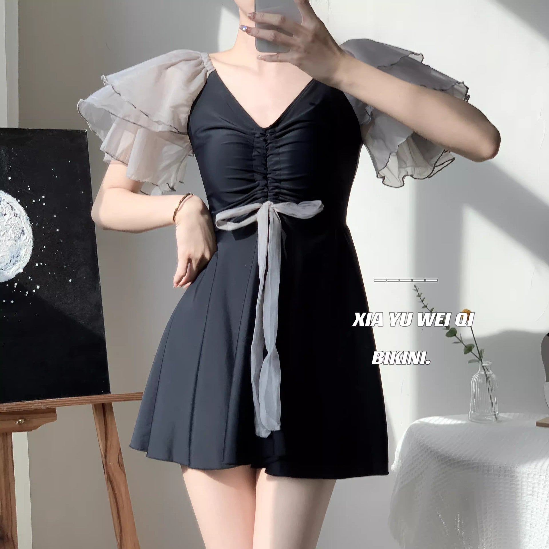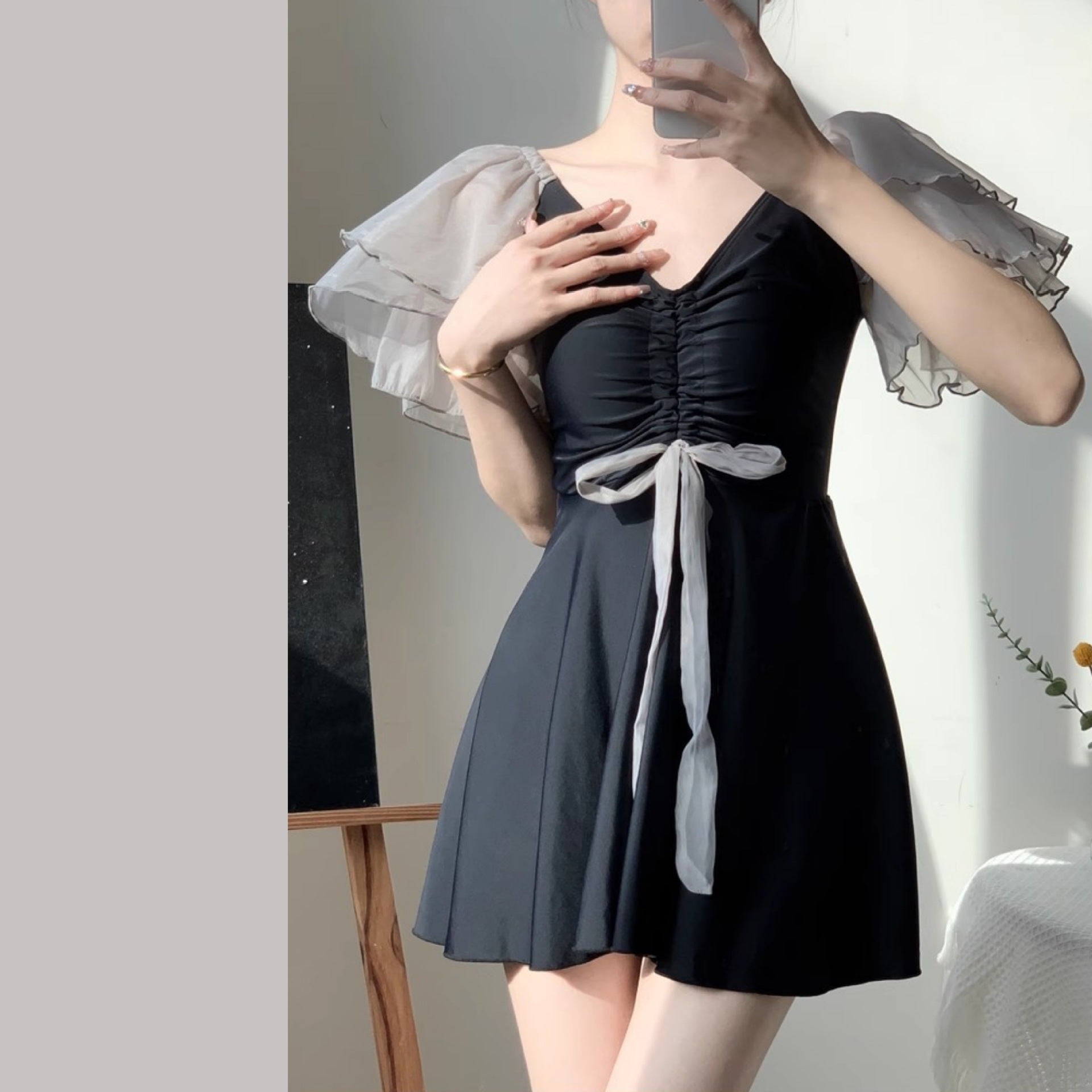 フェミニンなデザインが魅力的なワンピースタイプの水着です。肩をふんわり覆うオフショルダーとシフォンのフレアスリーブがエレガントな印象を演出。胸元のギャザーとリボンがポイントとなり、シルエットにメリハリを与えてくれます。スカート部分はフレアデザインで、気になるお腹やヒップラインをさりげなくカバー。プールやビーチリゾートでの優雅なひとときにぴったりの一着です。大人っぽさと可愛さを兼ね備えたデザインで、写真映えも抜群です。