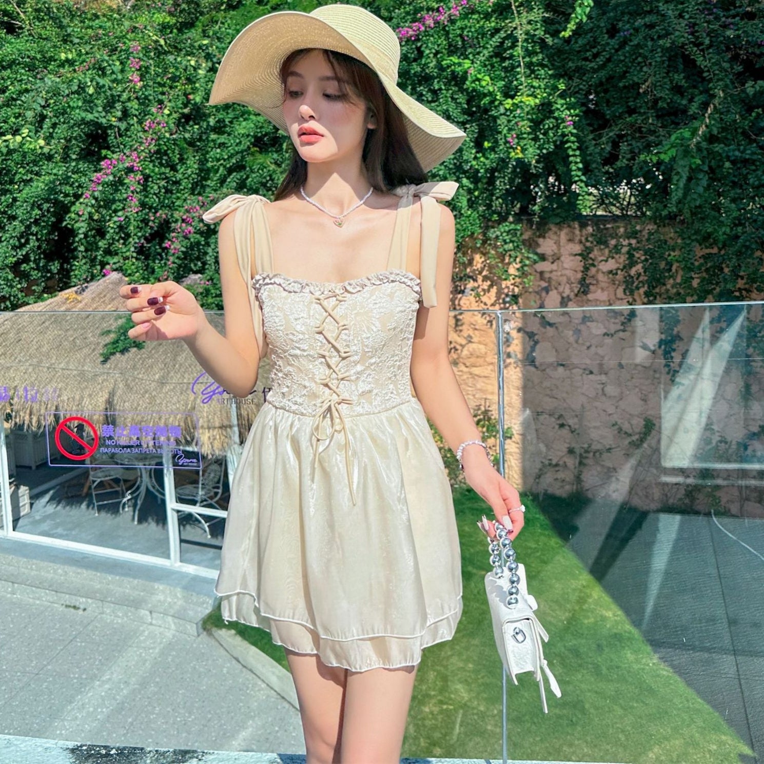 クラシカルなデザインが魅力のフレアワンピース水着です。フロントのレースアップと肩リボンがポイントになり、女性らしさを演出します。胸元のレースの切り替えと、ふんわりと広がるスカートが上品でエレガントな印象をプラス。背面には編み上げデザインを採用し、調節可能なフィット感を実現。高めのウエスト切り替えがスタイルアップを叶えます。ビーチやリゾート、ナイトプールなど特別なシーンにもぴったりな一着です。