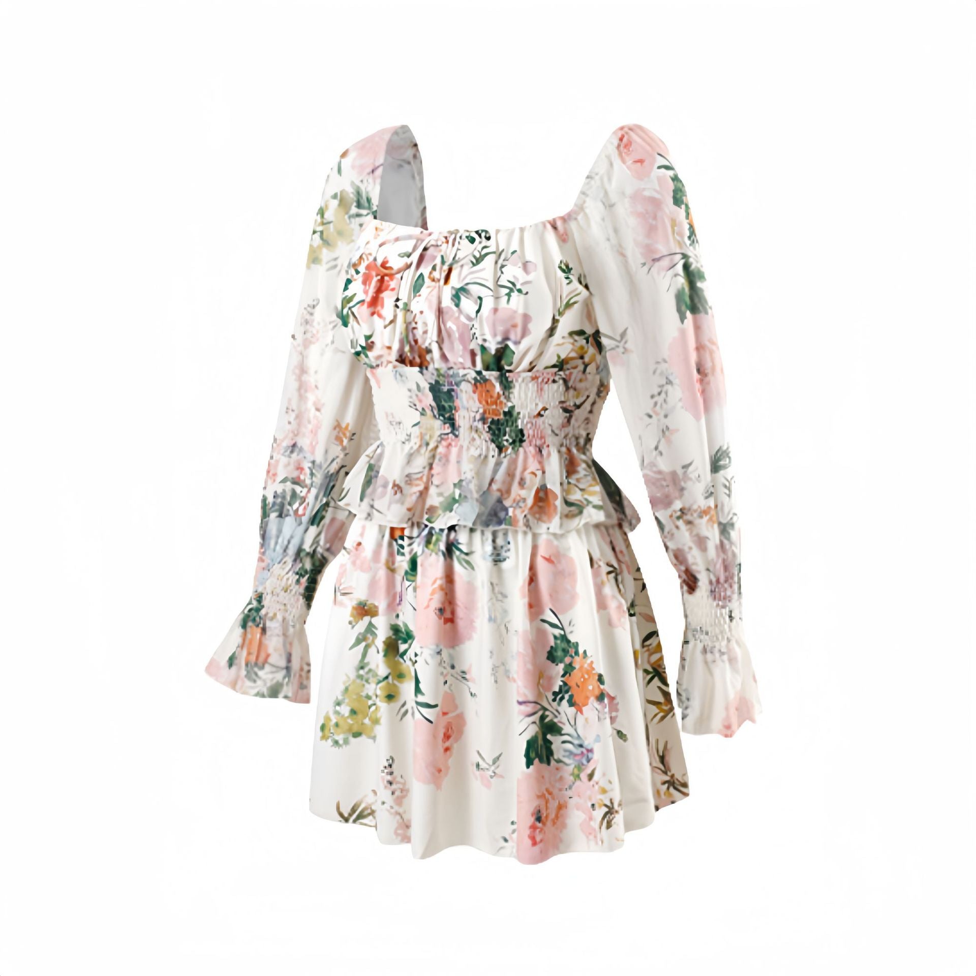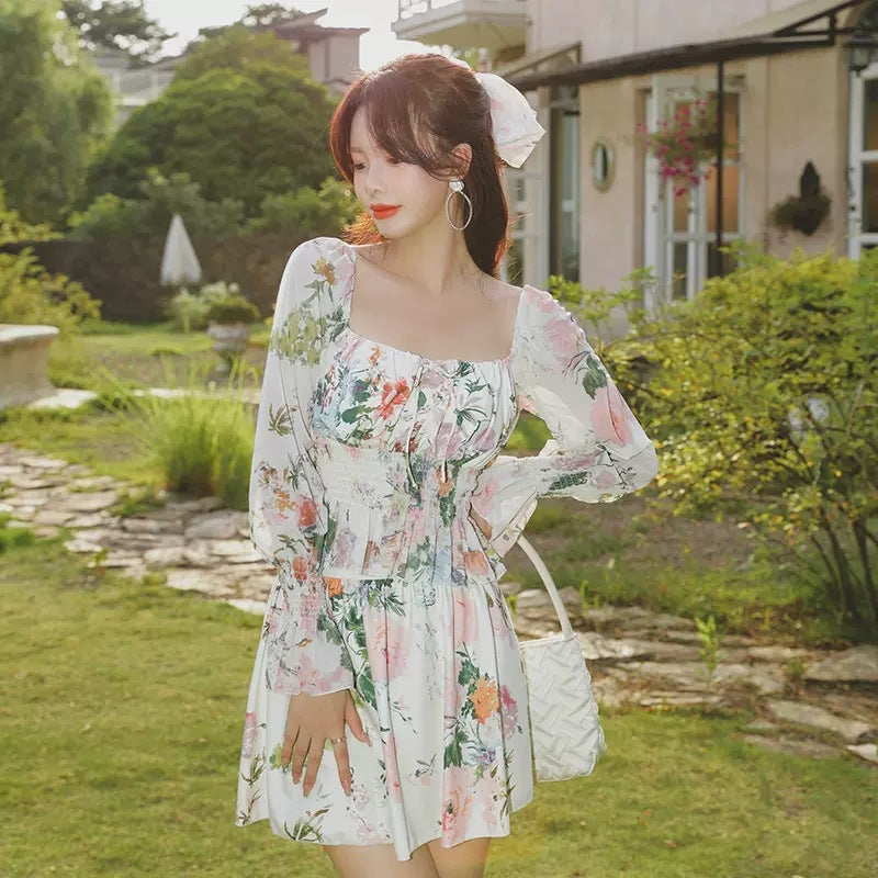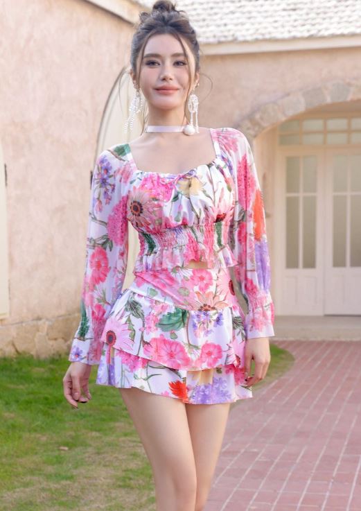 フェミニンな花柄プリントが魅力的なスモックワンピース風水着セットです。スクエアネックがデコルテを美しく見せ、胸元のシャーリングデザインが立体感を演出。ウエスト部分に程よくフィットし、スタイルアップ効果も期待できます。長袖デザインで紫外線対策にも◎。リゾートやビーチ、ナイトプールでも映えるデザインで、露出を抑えつつも可愛らしさをキープしたい方にぴったりです。