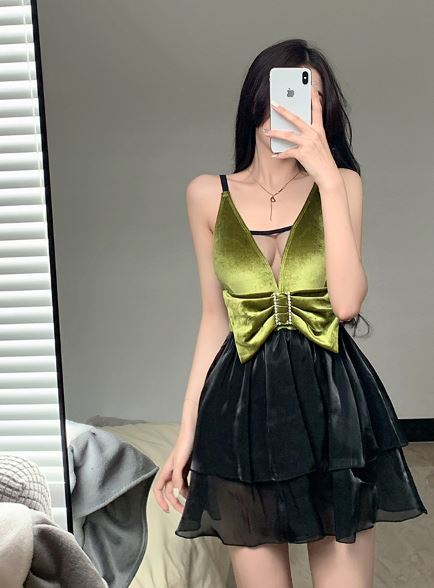 ウエスト位置が高めにデザインされているので、脚長効果が期待できます!また、ふんわり広がるチュールスカートがヒップや太ももをカバーし、気になる部分を自然に目立たなくしてくれます。胸元の大きなリボンが視線を上に集めることで、バランスの良いスタイルに仕上がります♪
