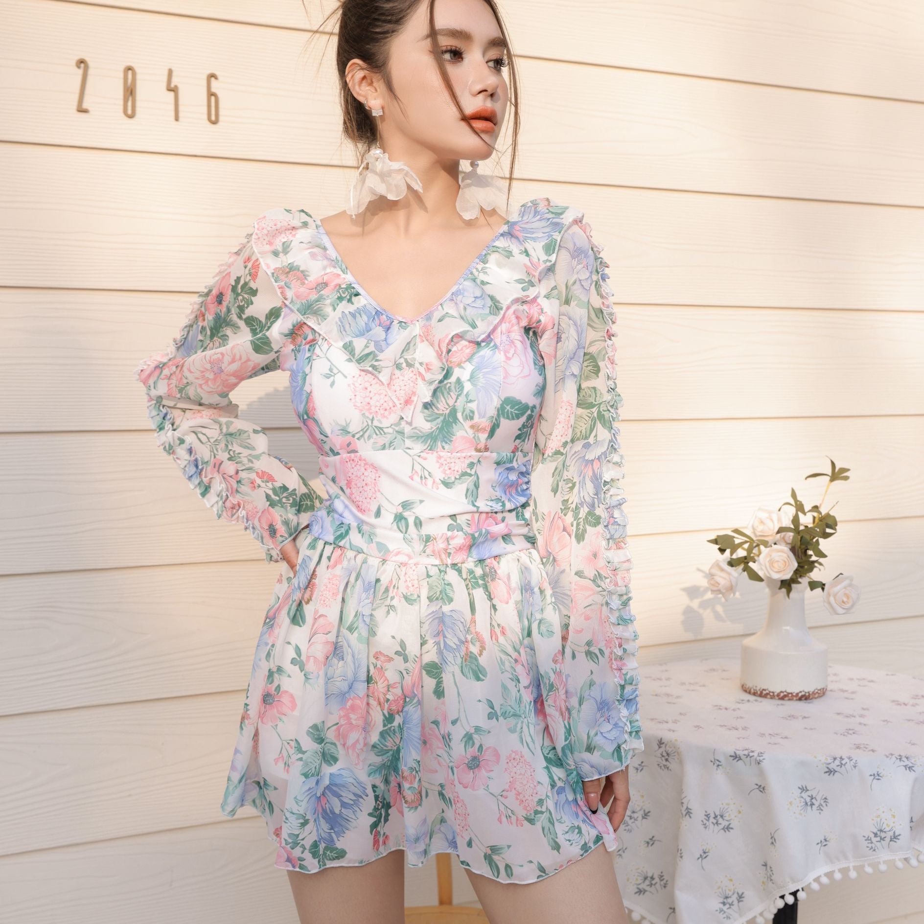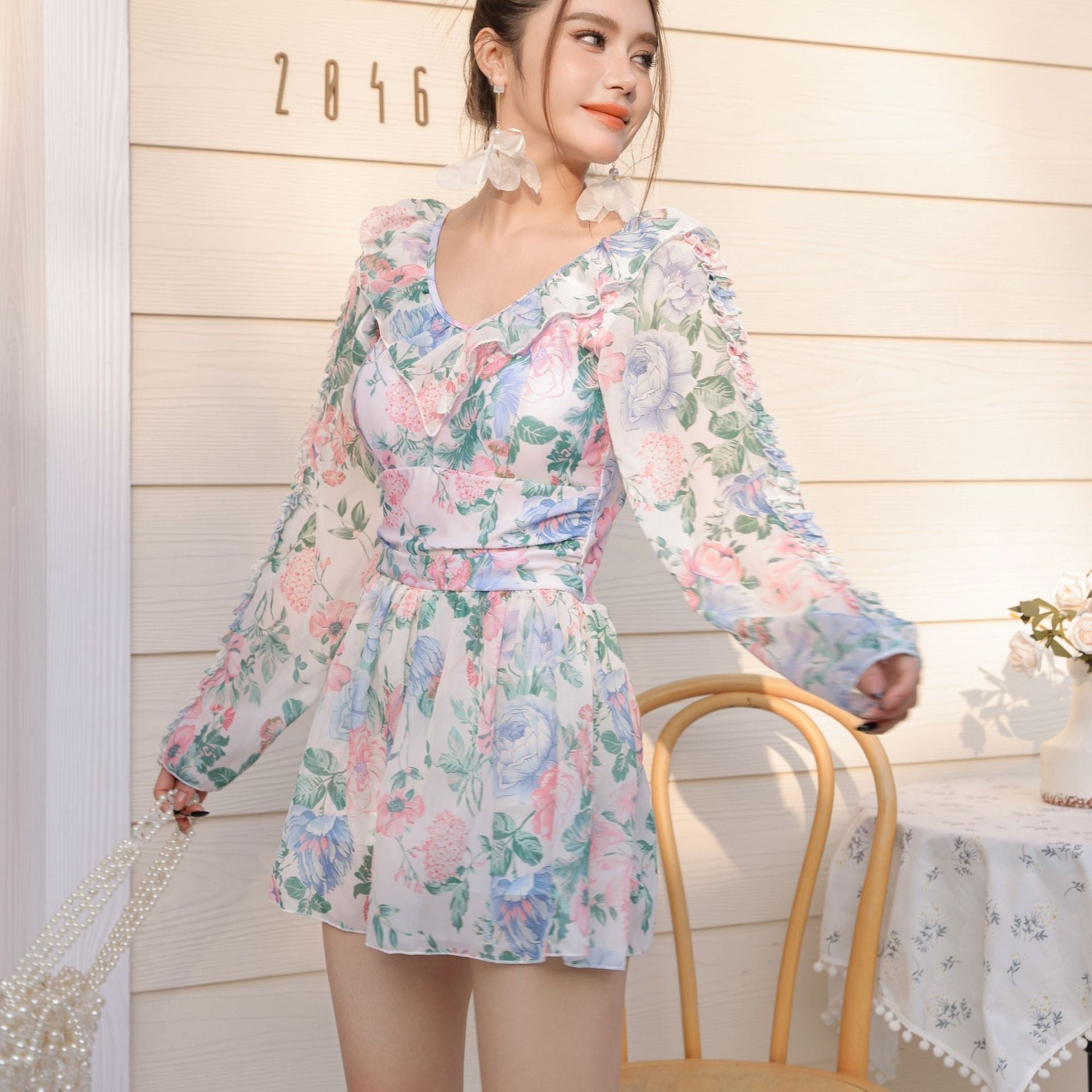 華やかなフラワープリントが目を引くボタニカルワンピース水着です。透け感のある軽やかな素材が上品さを演出し、長袖デザインで日焼けを気にする方にもおすすめです。背中部分には控えめなカットがあり、女性らしさをさりげなくアピールできます。リゾート地やプールサイドでの使用にぴったりのアイテムで、リラックスしたおしゃれを楽しみたい方にぴったりです。洗練されたデザインで大人の女性の魅力を引き立てます。