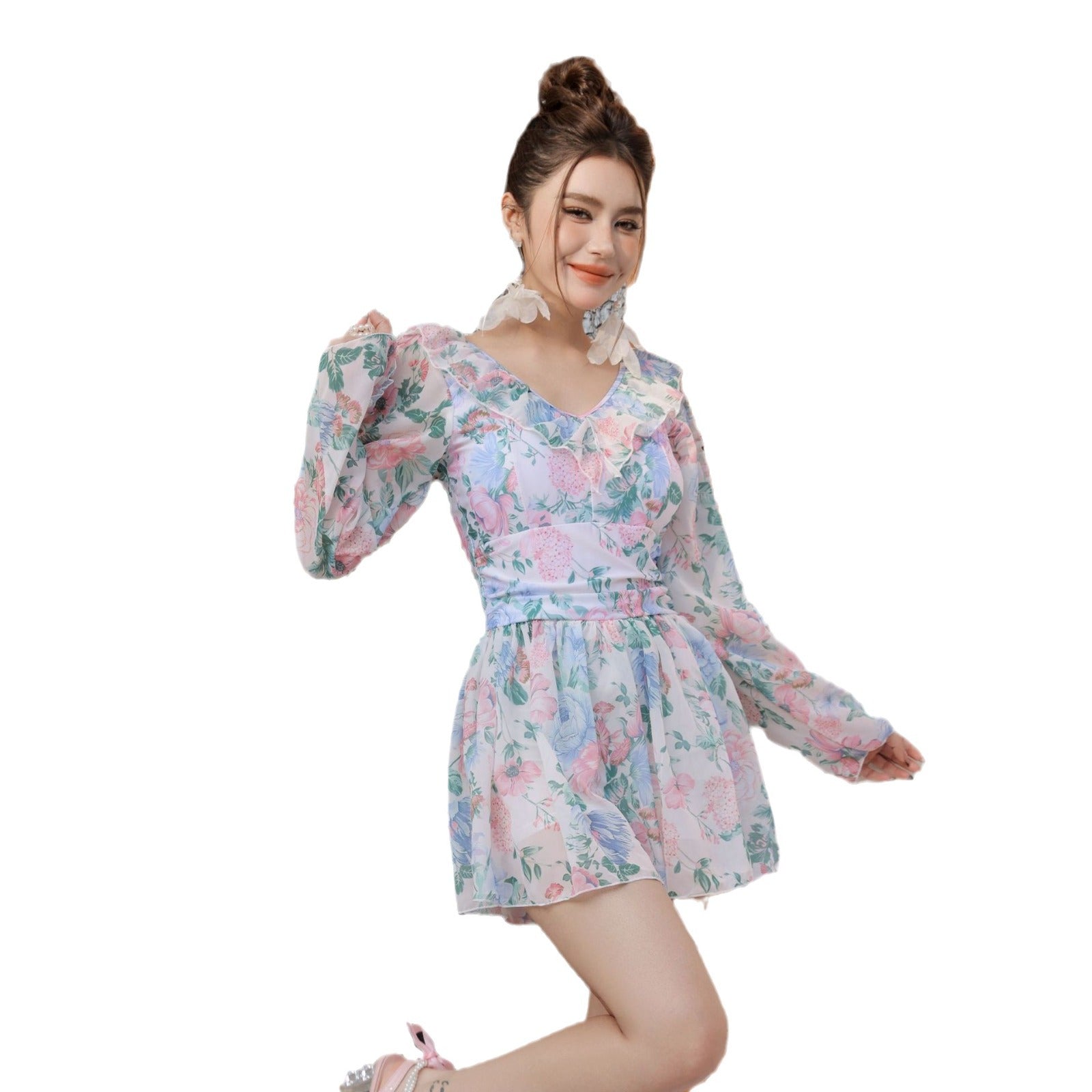 [商品名]:ワンピース 水着 エレガントフラワーボタニカル 透け感 フレア 体形カバー