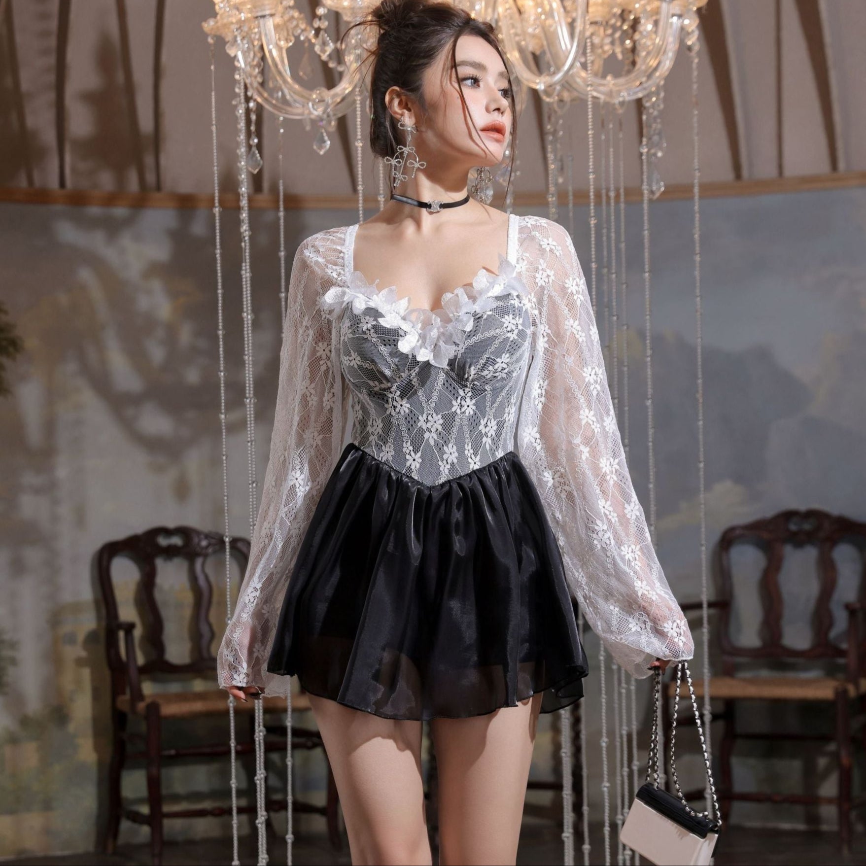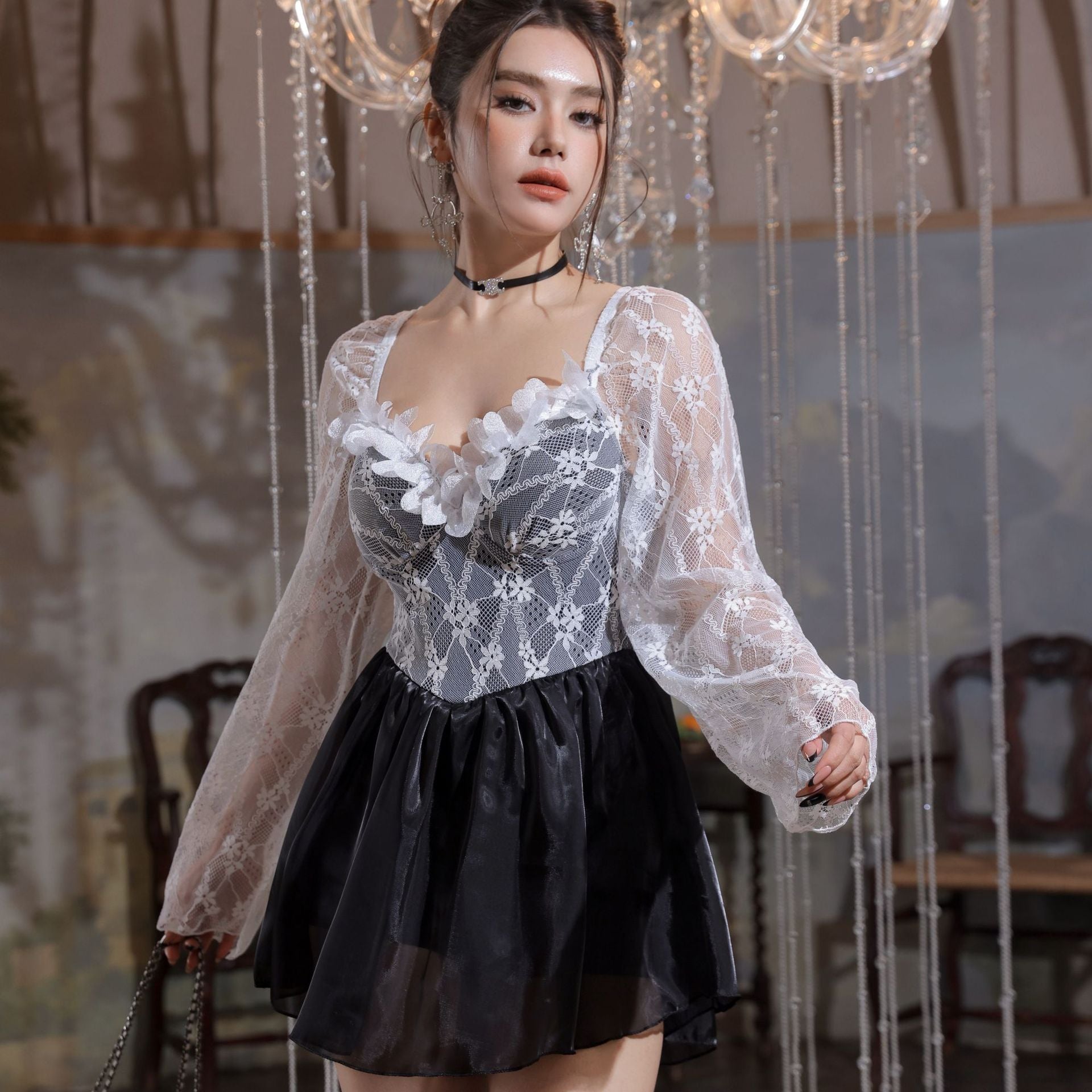 繊細なレースが胸元を彩るロングスリーブデザインのドレス風水着です。胸元のフリルが華やかさをプラスし、袖部分は透け感のある素材で軽やかな印象を与えます。ウエストの切り替えとフレアスカートが女性らしいシルエットを引き立て、スタイルアップを演出します。上品でエレガントなデザインはナイトプールやリゾートでの着用に最適です。ドレスのようなデザインながら、着心地の良さも兼ね備えていますので、特別なシーンでぜひご活用ください。