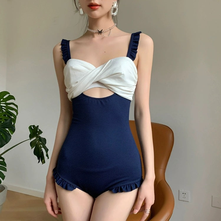 バスト部分のツイストデザインがポイントのツートンカラーワンピース水着です。バスト下にあしらわれたさりげないカットアウトで、程よい抜け感を演出。肩ひものフリルが大人かわいい雰囲気を加え、バックスタイルはシンプルながらも開放的なデザインです。ハイウエスト仕様でお腹周りをしっかりカバーし、スタイルアップ効果も期待できます。ビーチやリゾート、プールサイドで上品に魅せたい方におすすめの一着です。