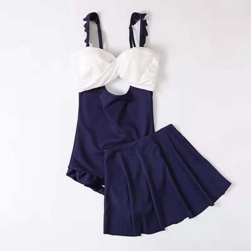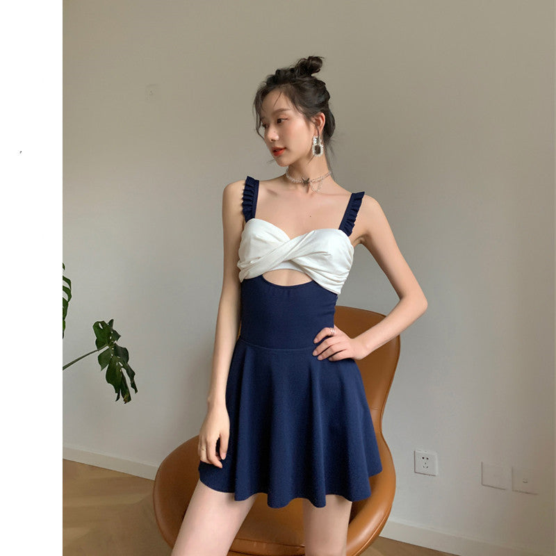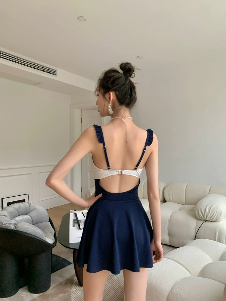 ウエスト位置が高めなので脚長効果抜群!バスト下のカットアウトがアクセントになり、視線を上に集めてくれます。フリル付き肩ひもで肩幅が気になる方にもおすすめです!