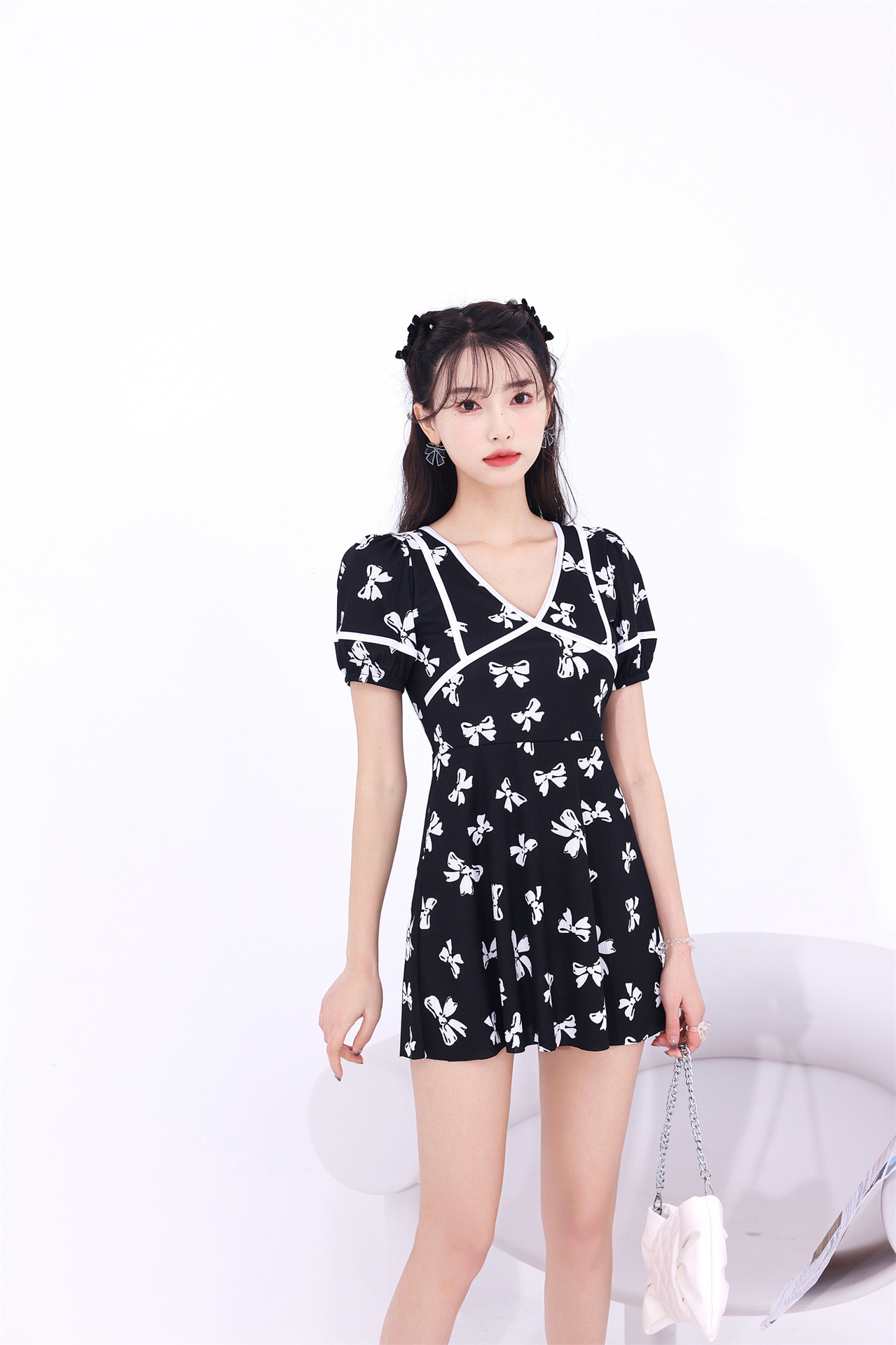 愛らしいリボン柄が散りばめられた、上品で大人可愛いワンピース水着です。胸元のVネックとウエスト切り替えデザインでスタイルアップ効果も抜群。ふんわりとしたパフスリーブが気になる肩周りをカバーし、フレアスカートが下半身を自然に隠してくれます。ビーチやリゾート、プールで大人っぽさと可愛さを両立したい方にぴったり。クラシックな雰囲気で写真映えする一着です。