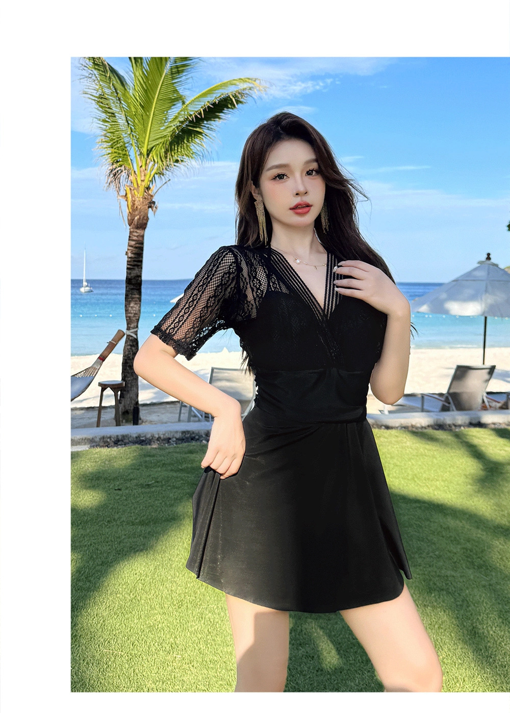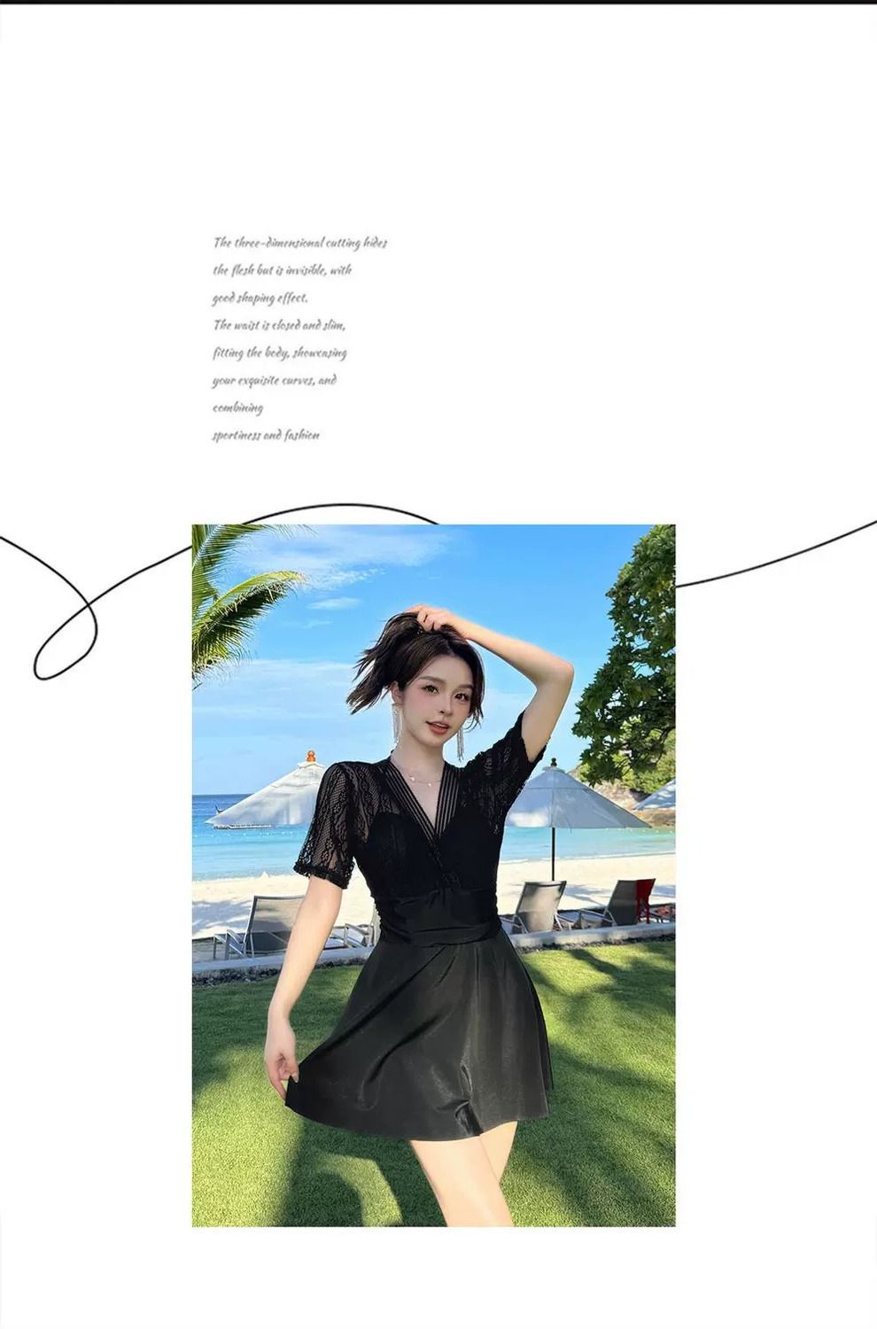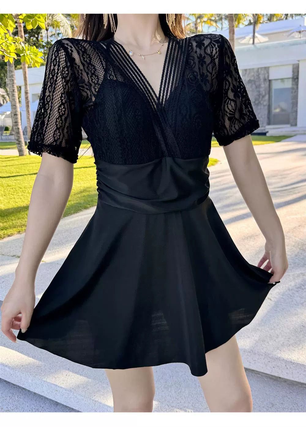[商品名]:ワンピース 水着 レーススリーブ Vネック 美デコルテ フレア 体形カバー