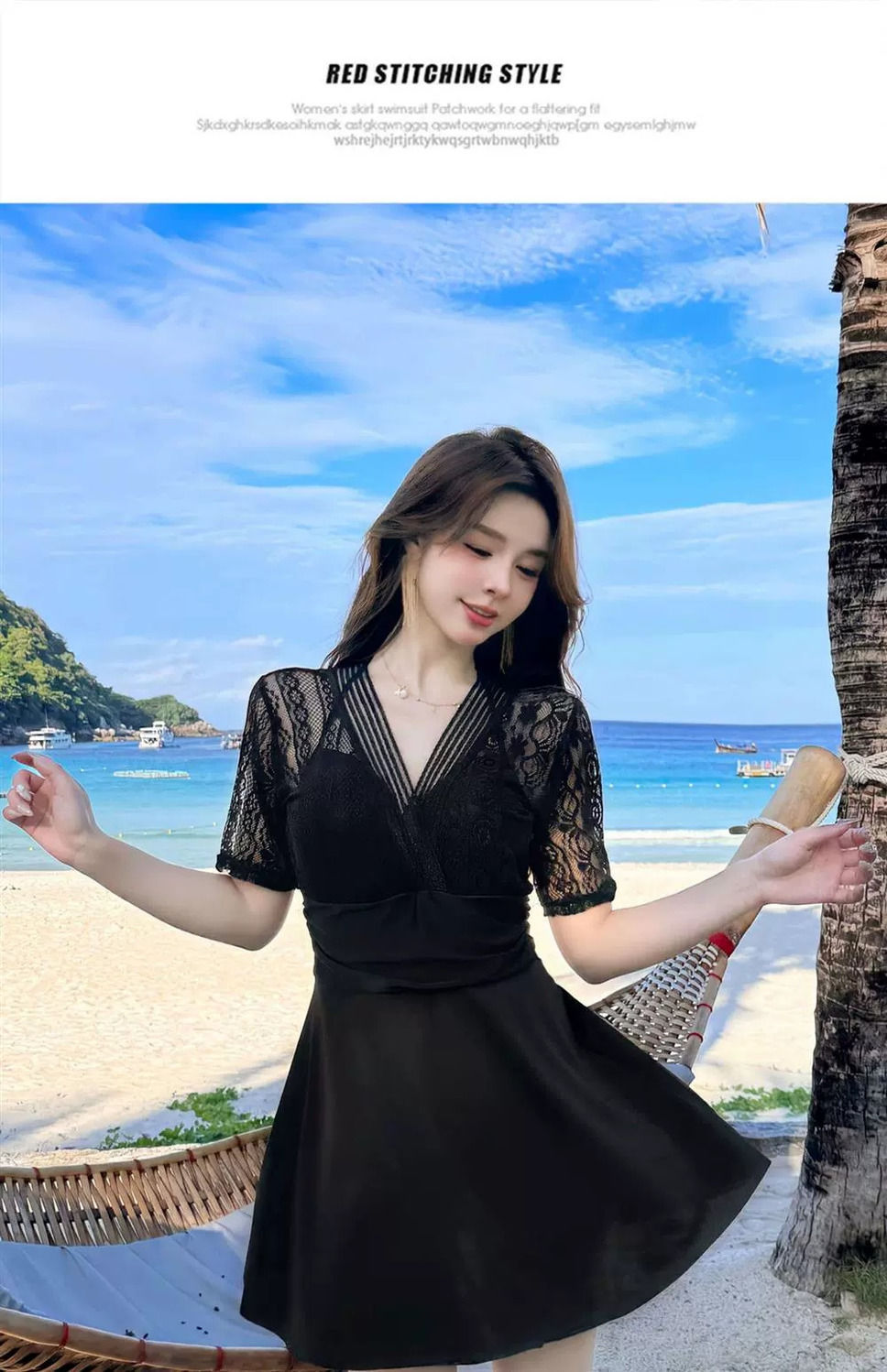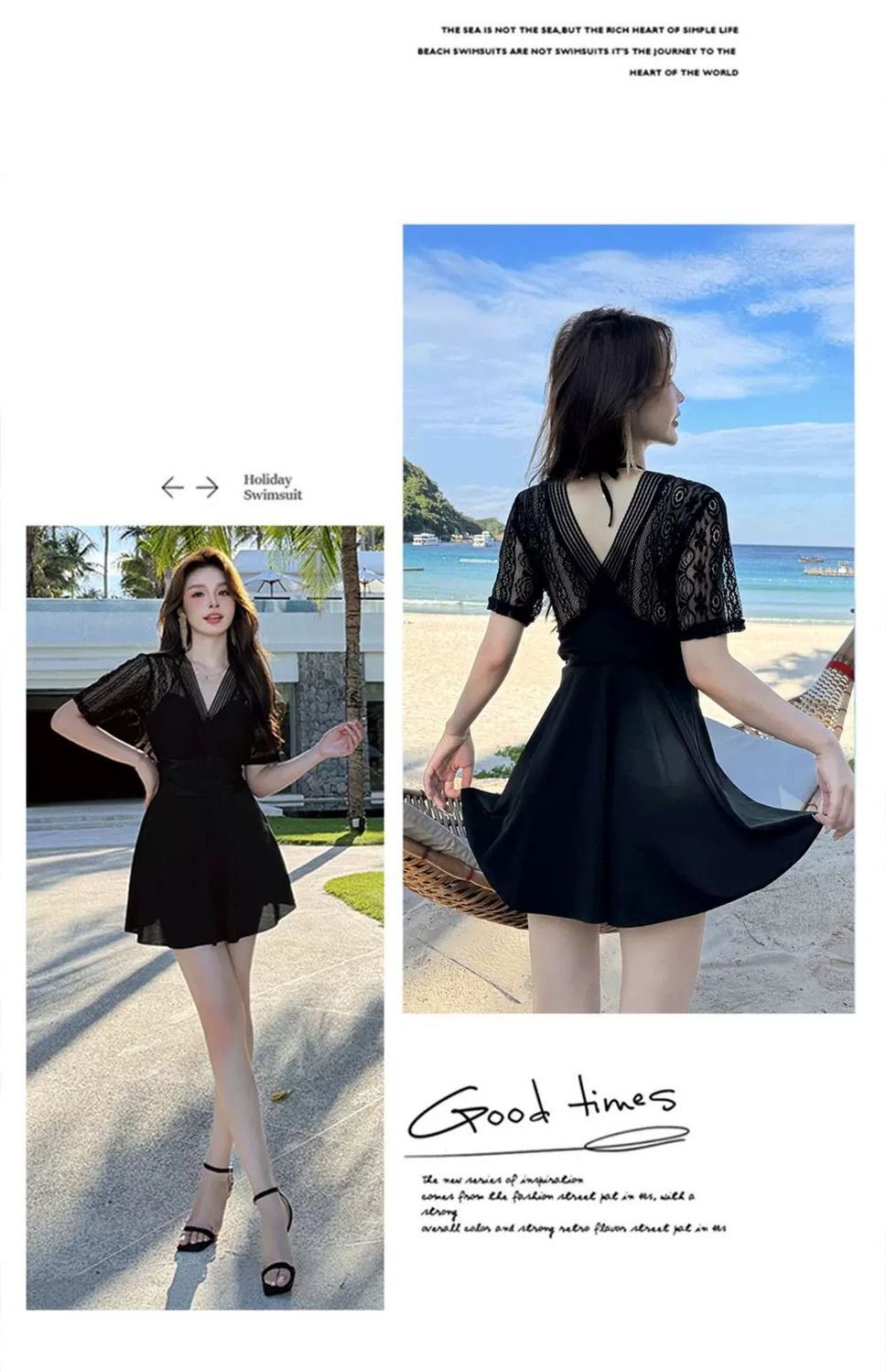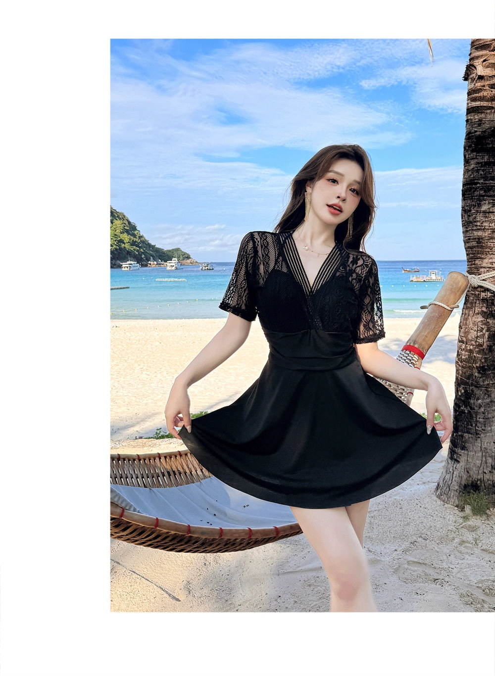 [商品名]:ワンピース 水着 レーススリーブ Vネック 美デコルテ フレア 体形カバー