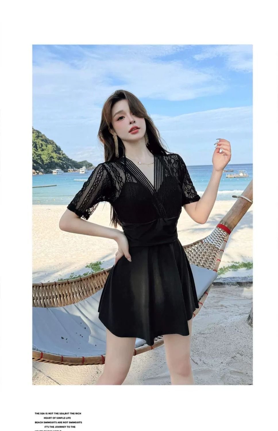 レーススリーブが二の腕をカバーしてくれます!フレアスカートで下半身をしっかり隠し、ウエストの切り替えでくびれ効果も。控えめな露出が嬉しい水着です♪