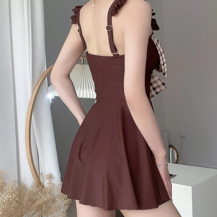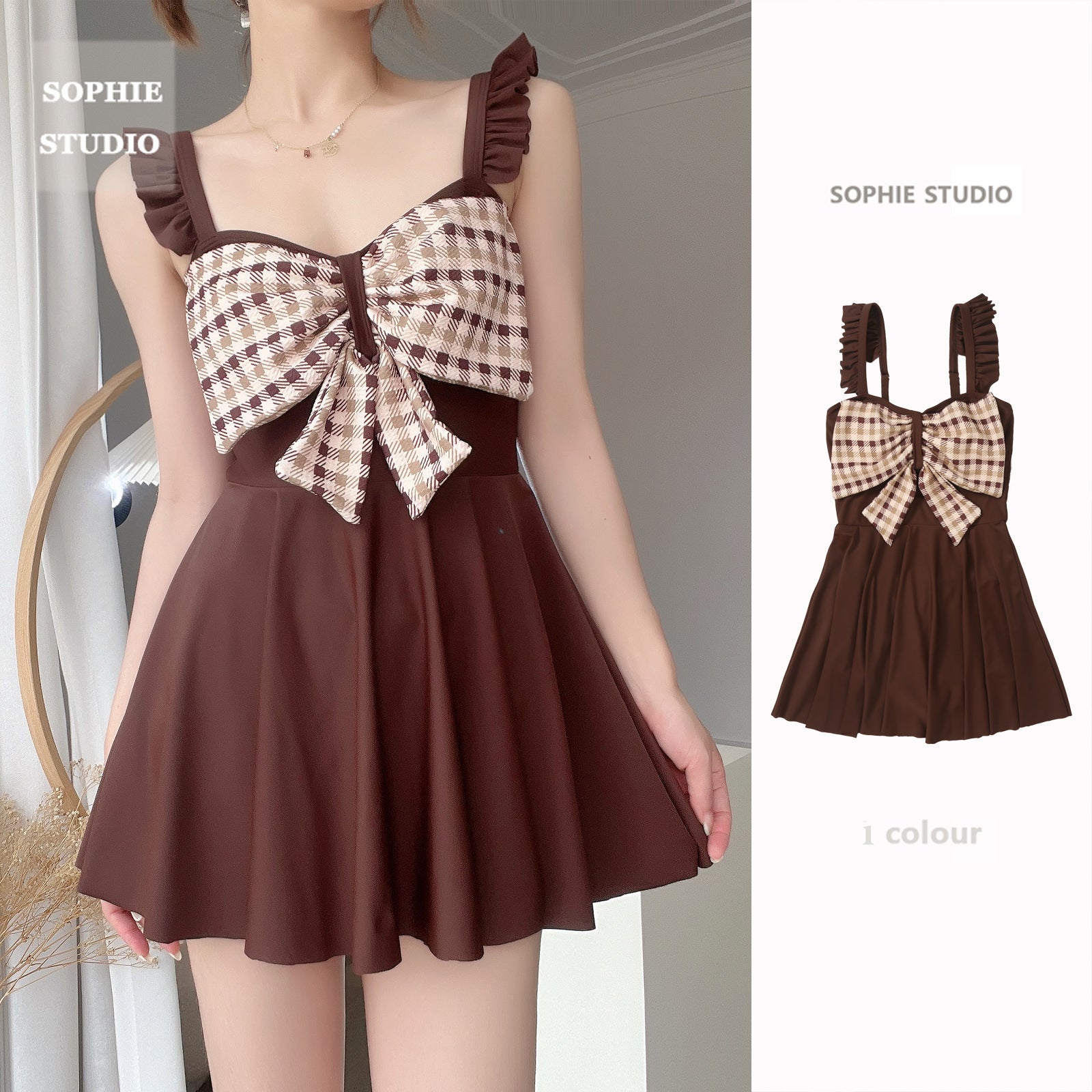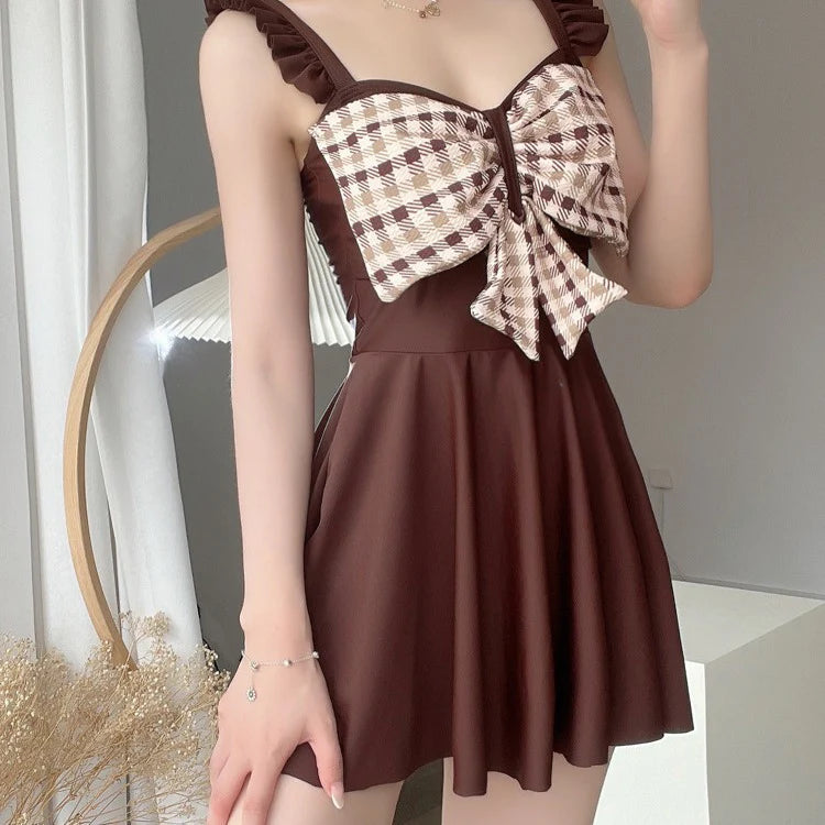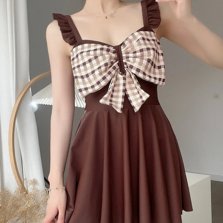 ワンピース 水着 リボン付きチェック柄 ショルダーデザイン フレア 体形カバー