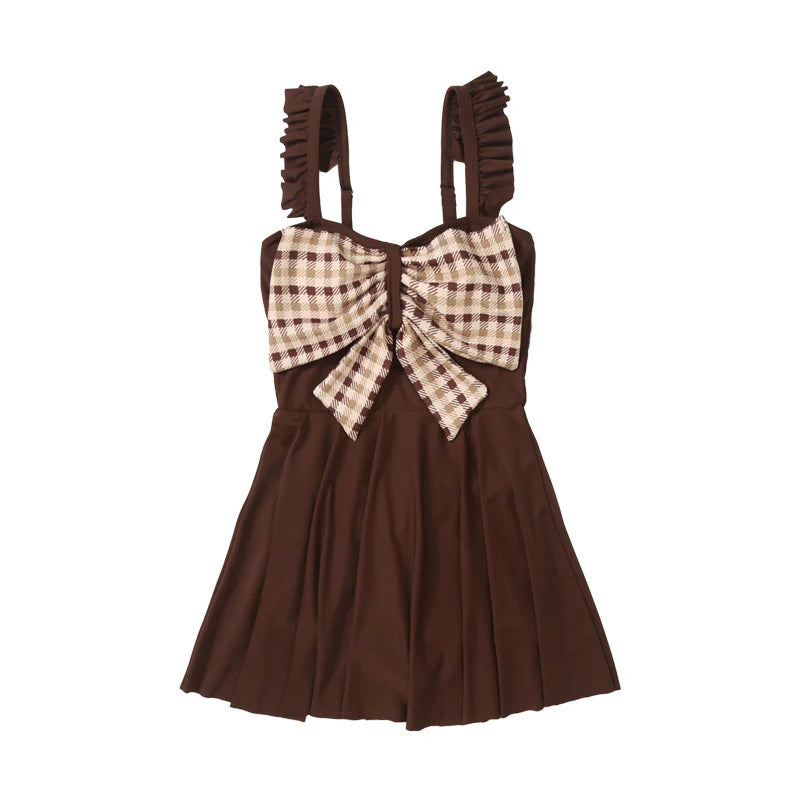 大きなチェック柄リボンが胸元で目を惹く、ワンピースタイプの水着です。フリル付きのショルダーデザインが甘さをプラスし、程よく肩をカバー。フレアスカートがふわっと広がり、気になる下半身を自然に隠してくれます。リボンが視線を上に集めるため、スタイルアップ効果も抜群。背中はシンプルなデザインで、後ろ姿もすっきりと見えます。ビーチやプールでかわいらしさを演出しつつ、しっかり体形カバーが叶う大人女子にぴったりの一枚です。